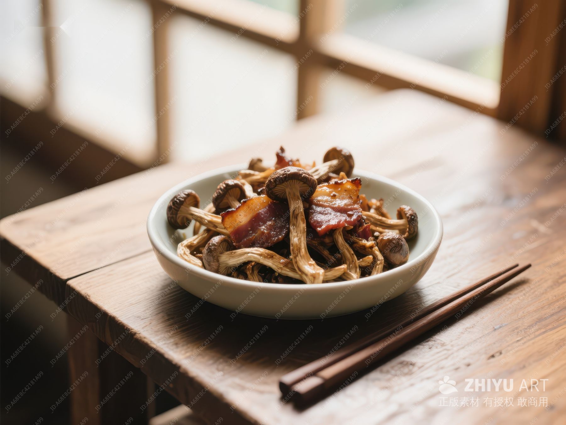 菌菇培根炒菜,木桌上的美味佳肴 424