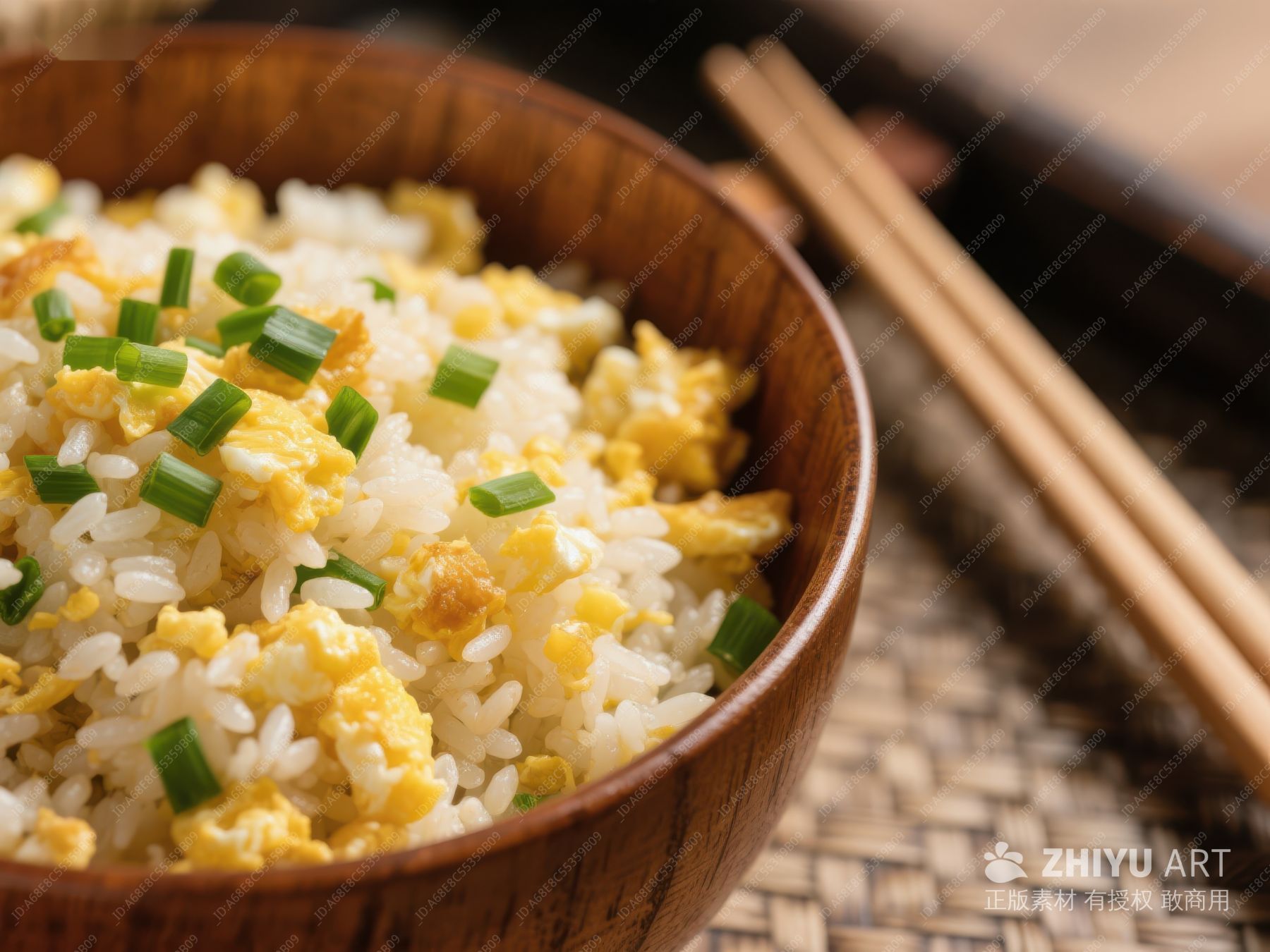 一个碗里盛着米饭,上面撒着葱和黑芝麻,放在一个木制