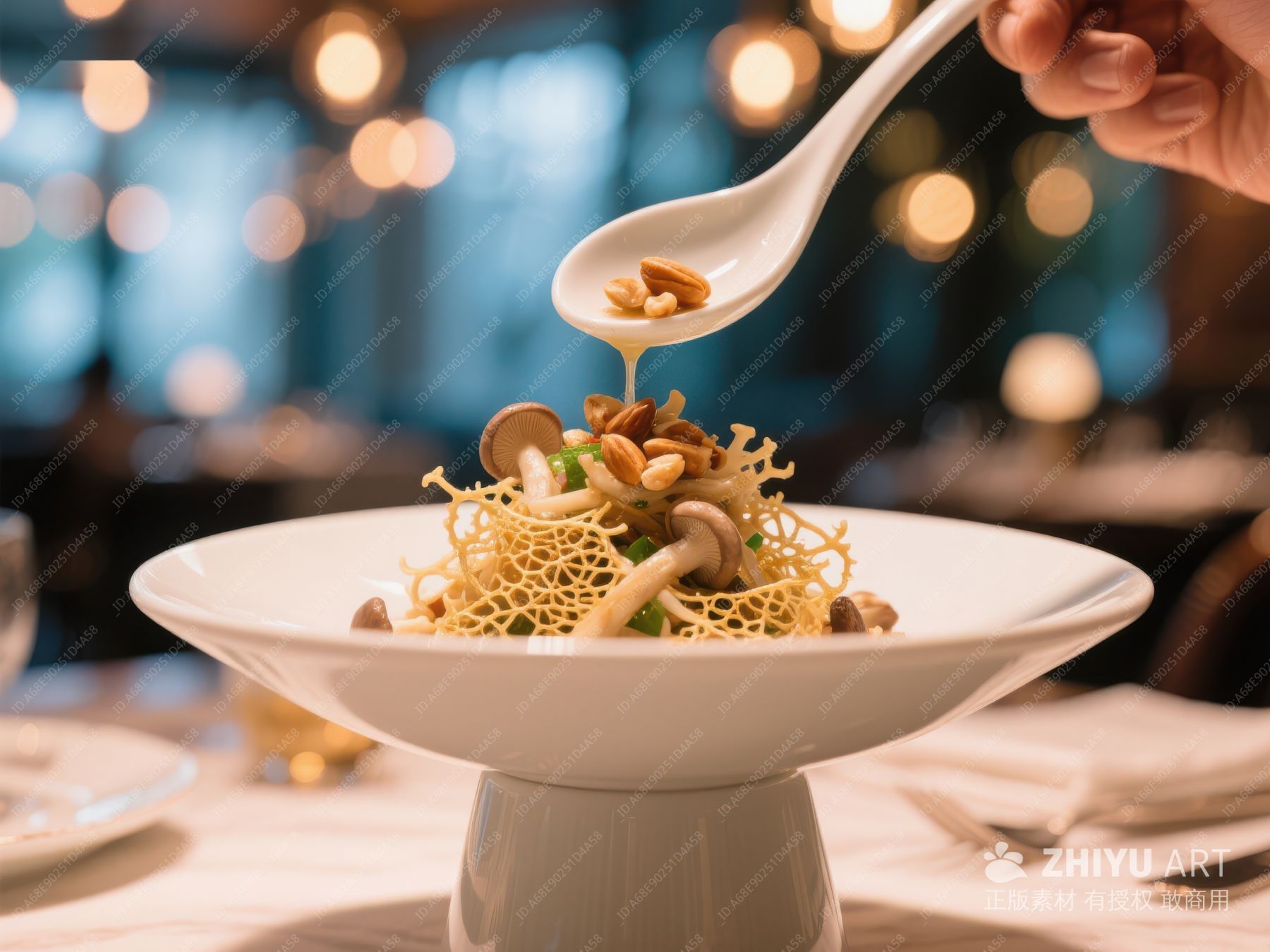 精致菌菇菜肴,勺子舀起美味瞬间 483