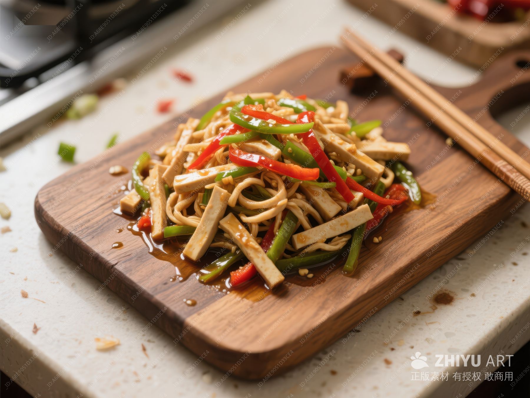 木盘上的彩椒炒豆干 1050