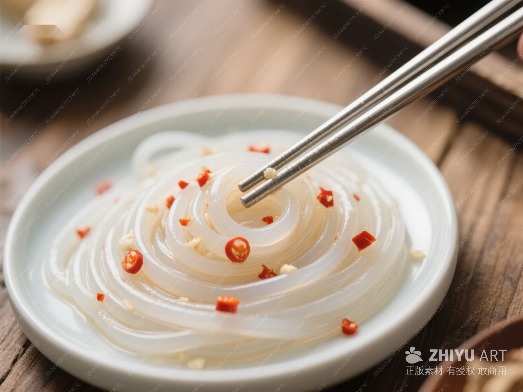 精致盘旋的透明凉粉配以辣椒点缀 513