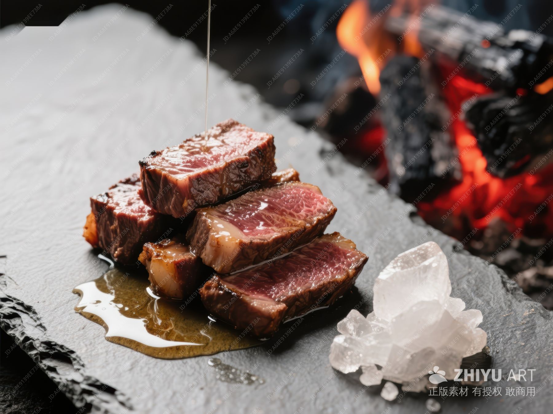煎制牛排配岩盐,炭火背景 412
