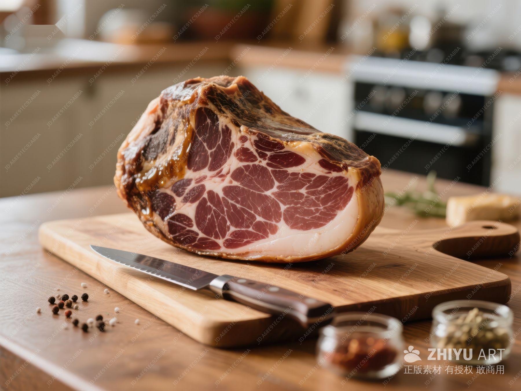 火腿置于木板,配刀具特写 192