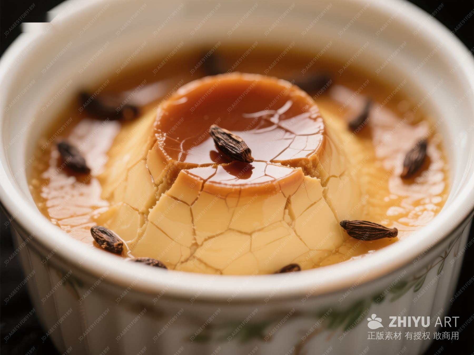 焦糖布丁特写,表面裂纹与香料点缀 239