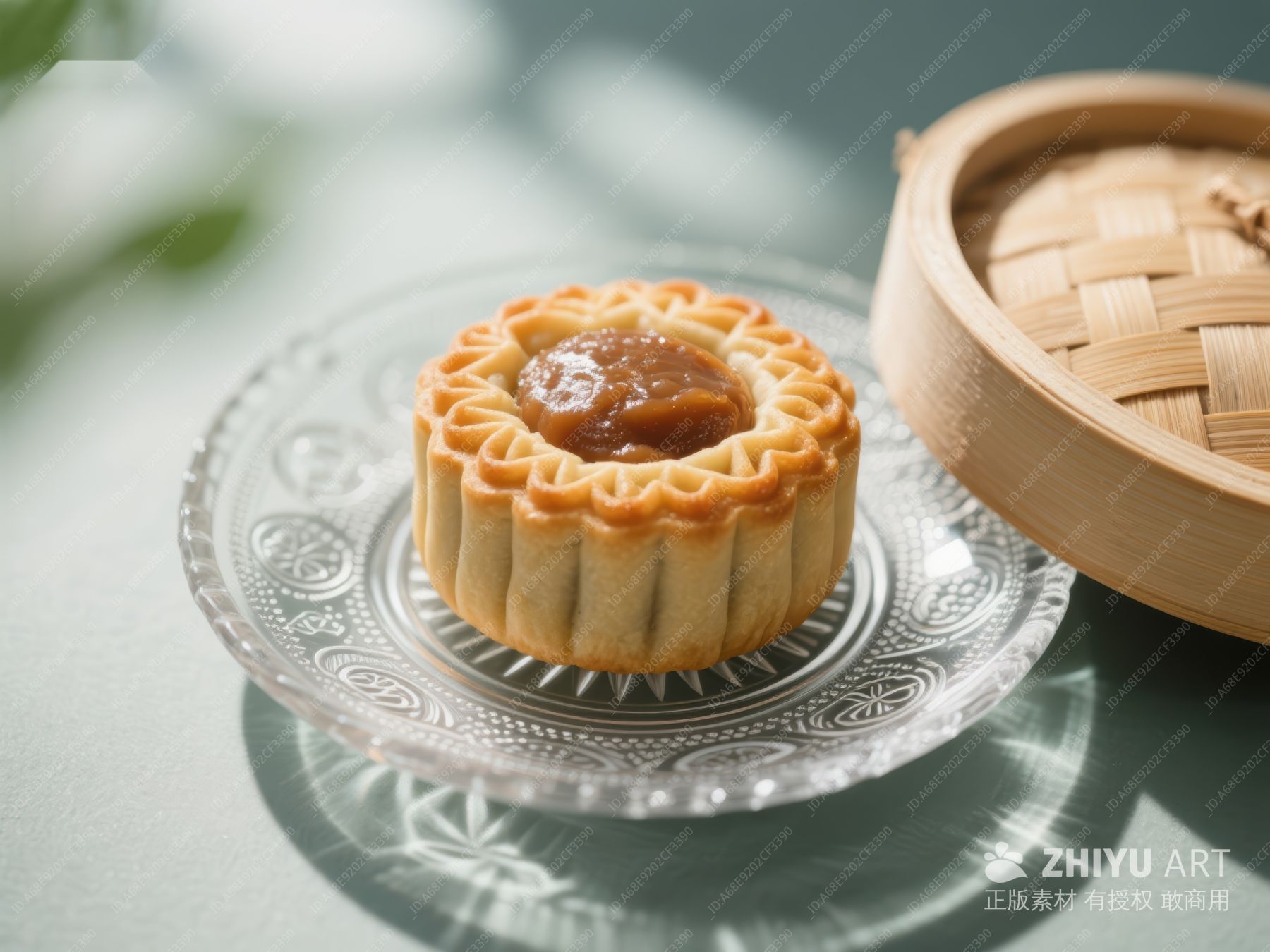 精致月饼置于透明盘中,旁配竹制蒸笼 295