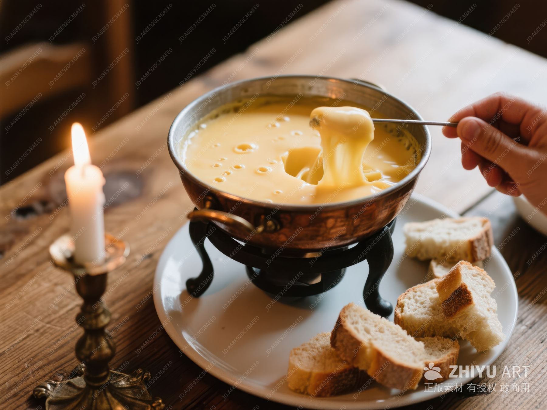 热气腾腾的奶酪火锅配面包和白葡萄酒 490