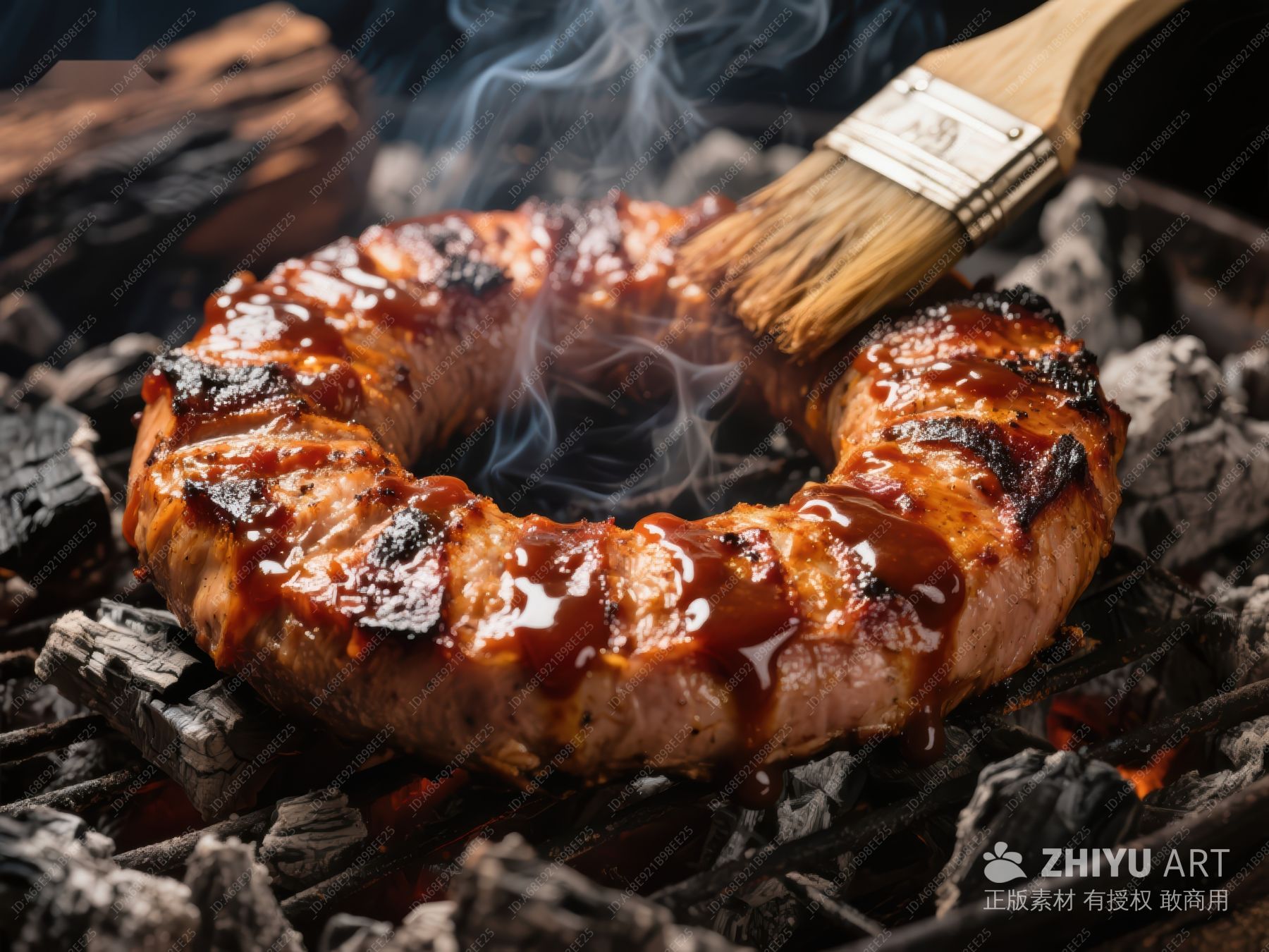 烧烤肉环,涂抹酱料,烟雾缭绕 558