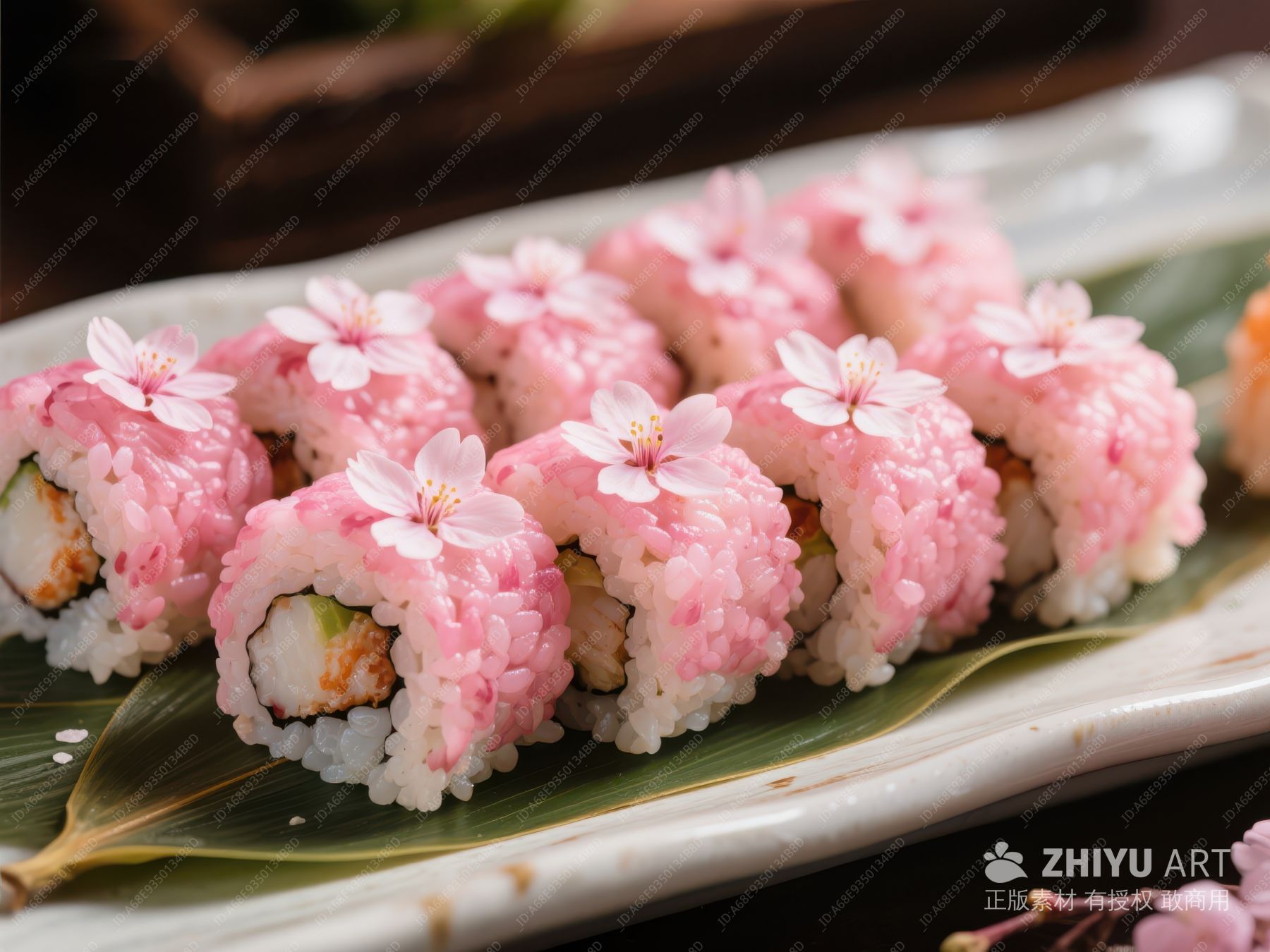 一盘色彩鲜艳的寿司,上面摆放着各种新鲜的寿司卷、生
