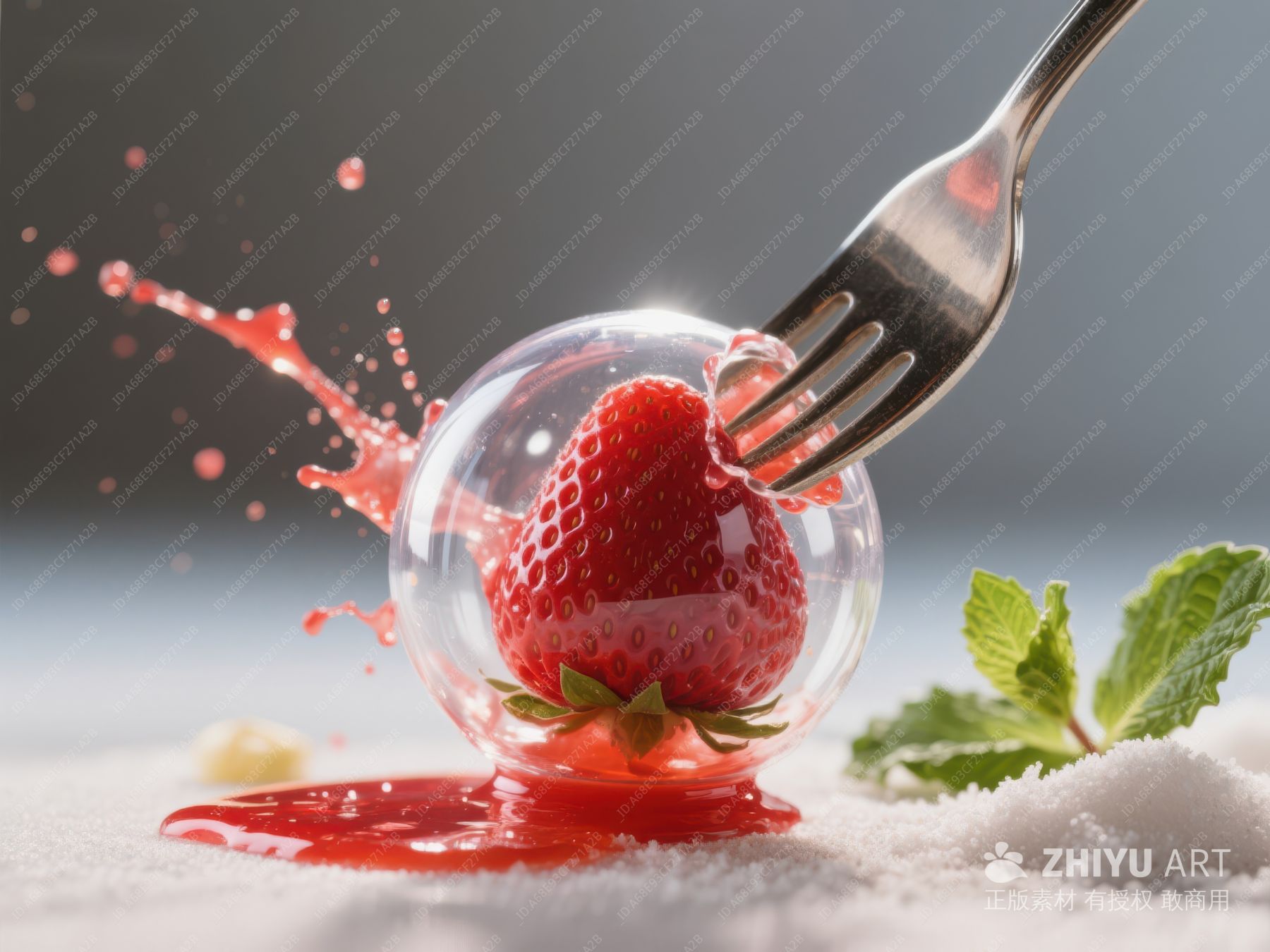 叉子挑起草莓,果汁四溅