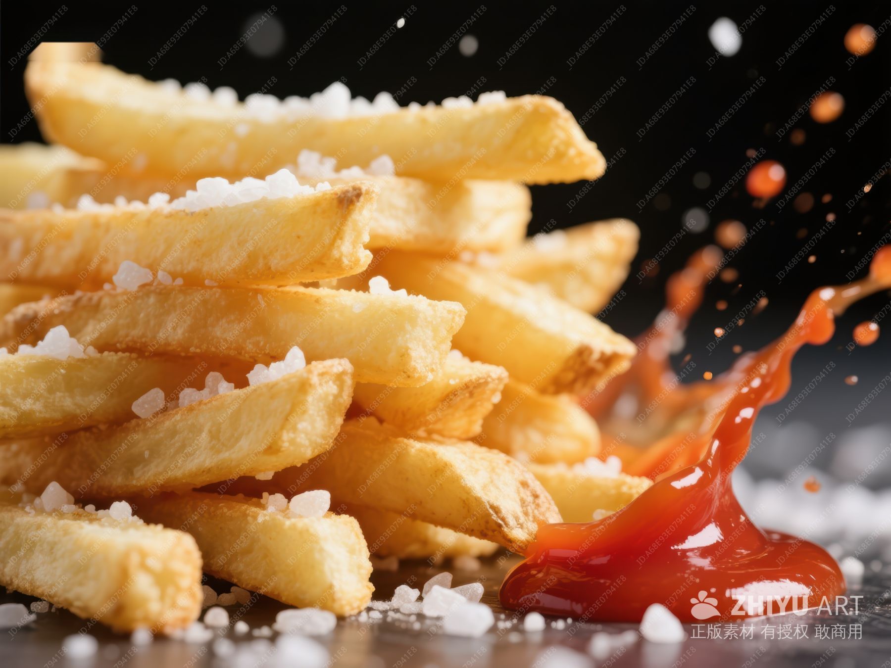 金黄薯条配番茄酱飞溅瞬间