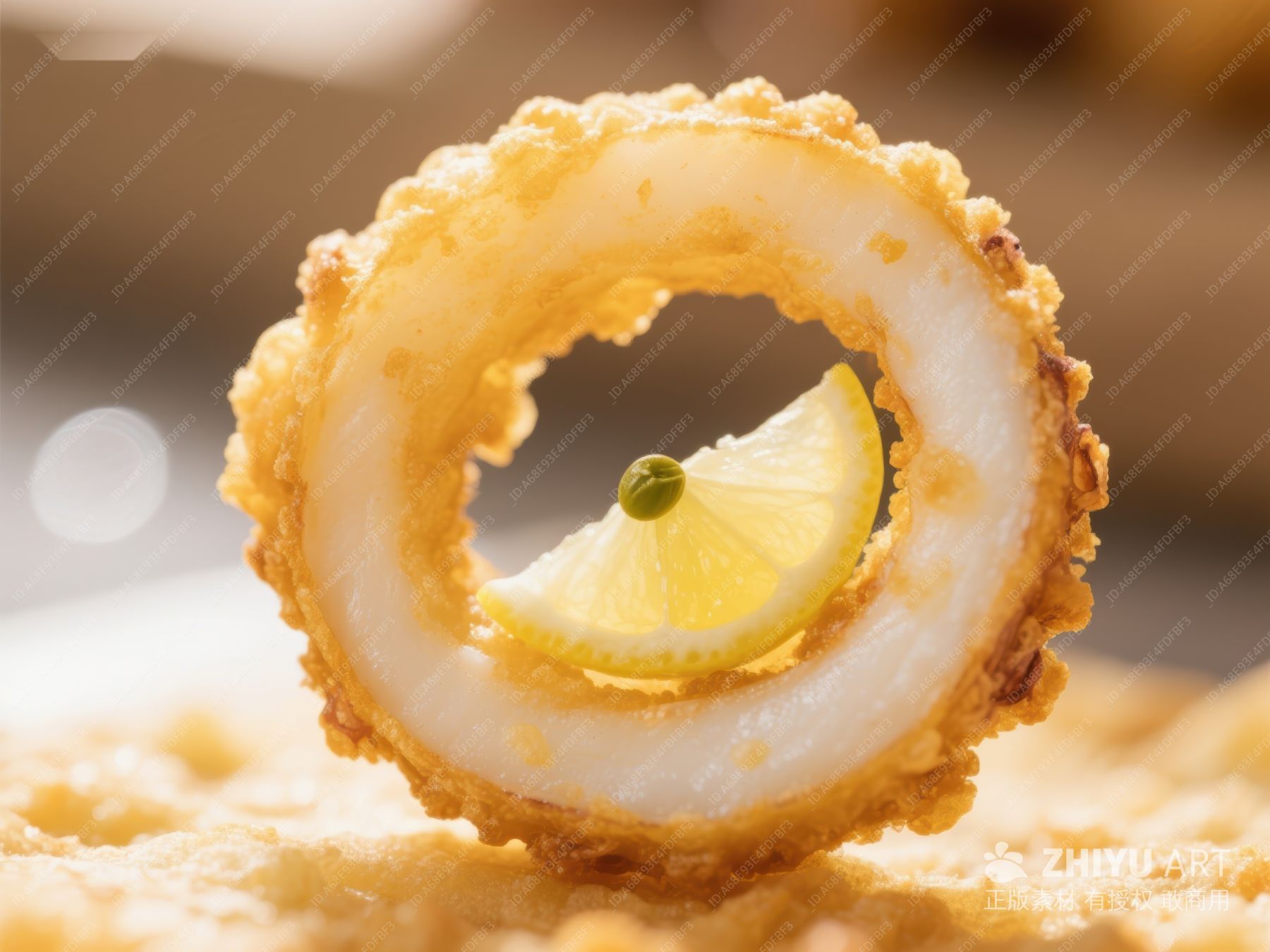 金黄酥脆的炸鱿鱼圈配柠檬片