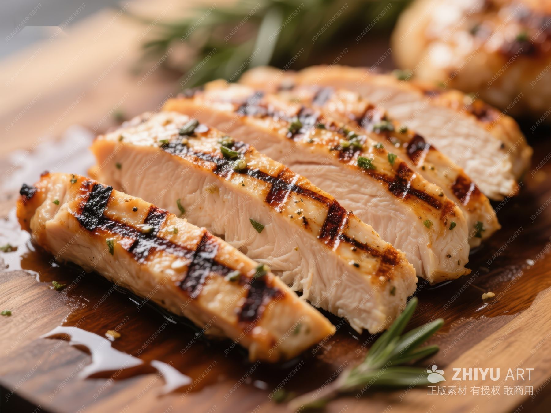 木制砧板上放置着两块烤鸡肉,其中一块已被切开。旁边