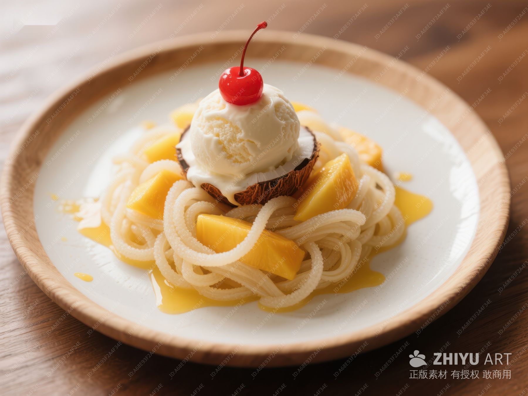 椰壳冰淇淋配芒果面条甜品