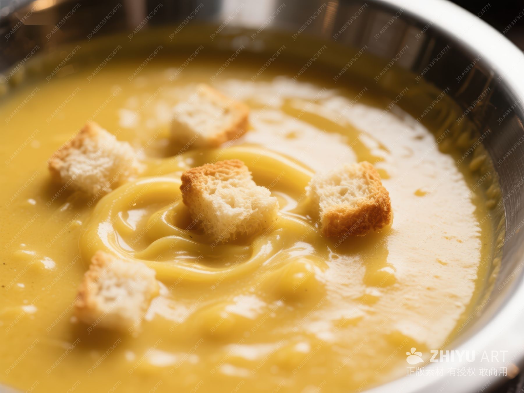 一碗浓稠的南瓜汤,顶部漩涡状地淋着奶油,奶油上堆叠
