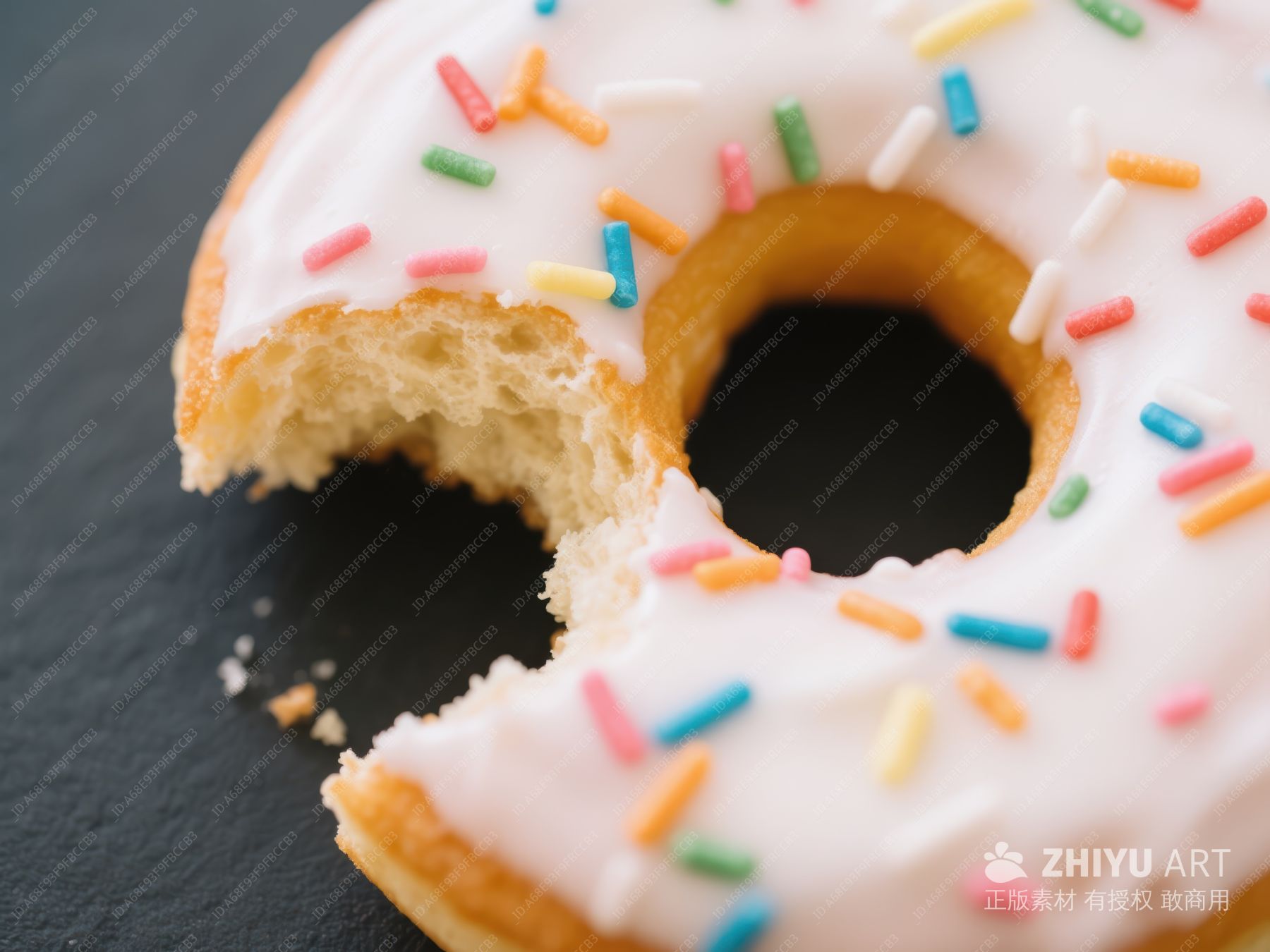 咬过的甜甜圈,白色糖霜与彩色洒粒