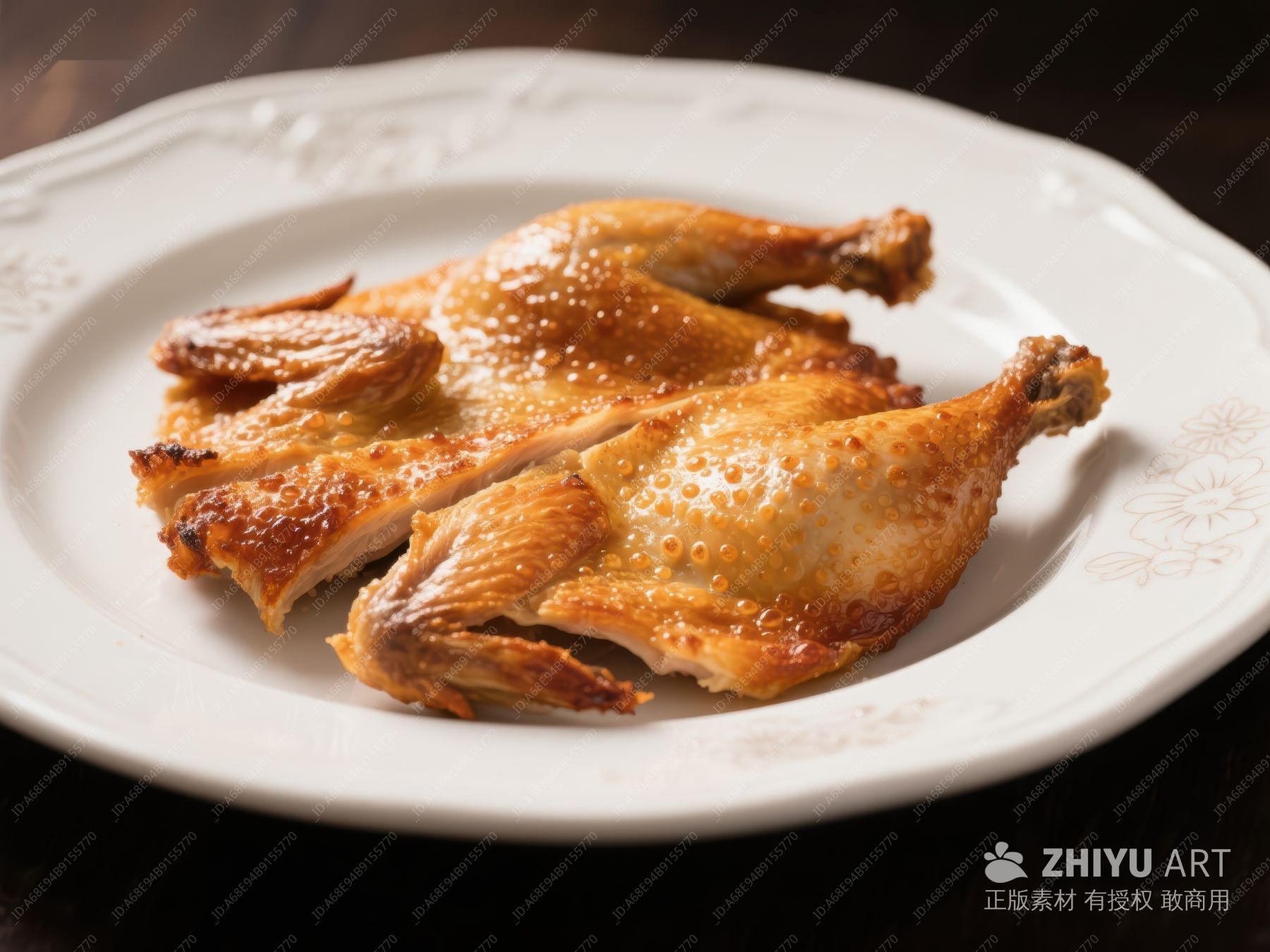 烤鸡金黄诱人,置于古朴盘中 565