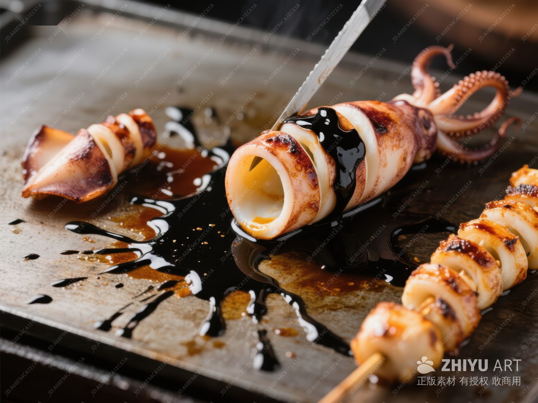 烤鱿鱼串,撒上芝麻和辣椒 304