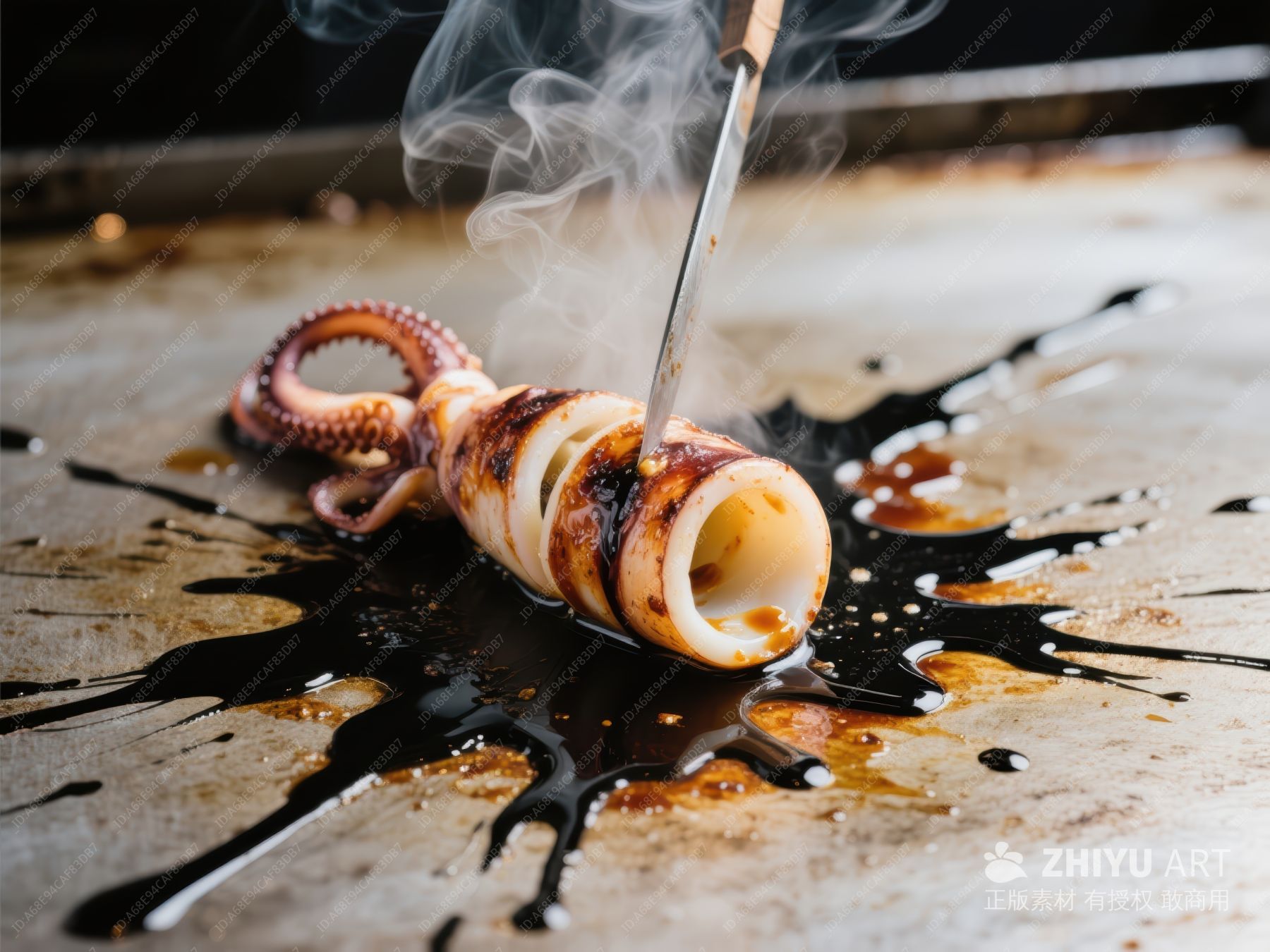 酱汁淋洒的烤鱿鱼
