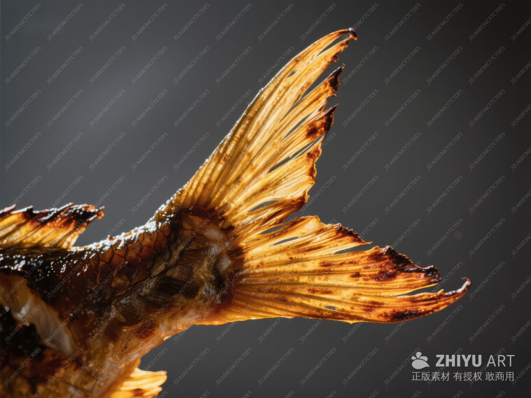 烤鱼尾特写,色泽金黄