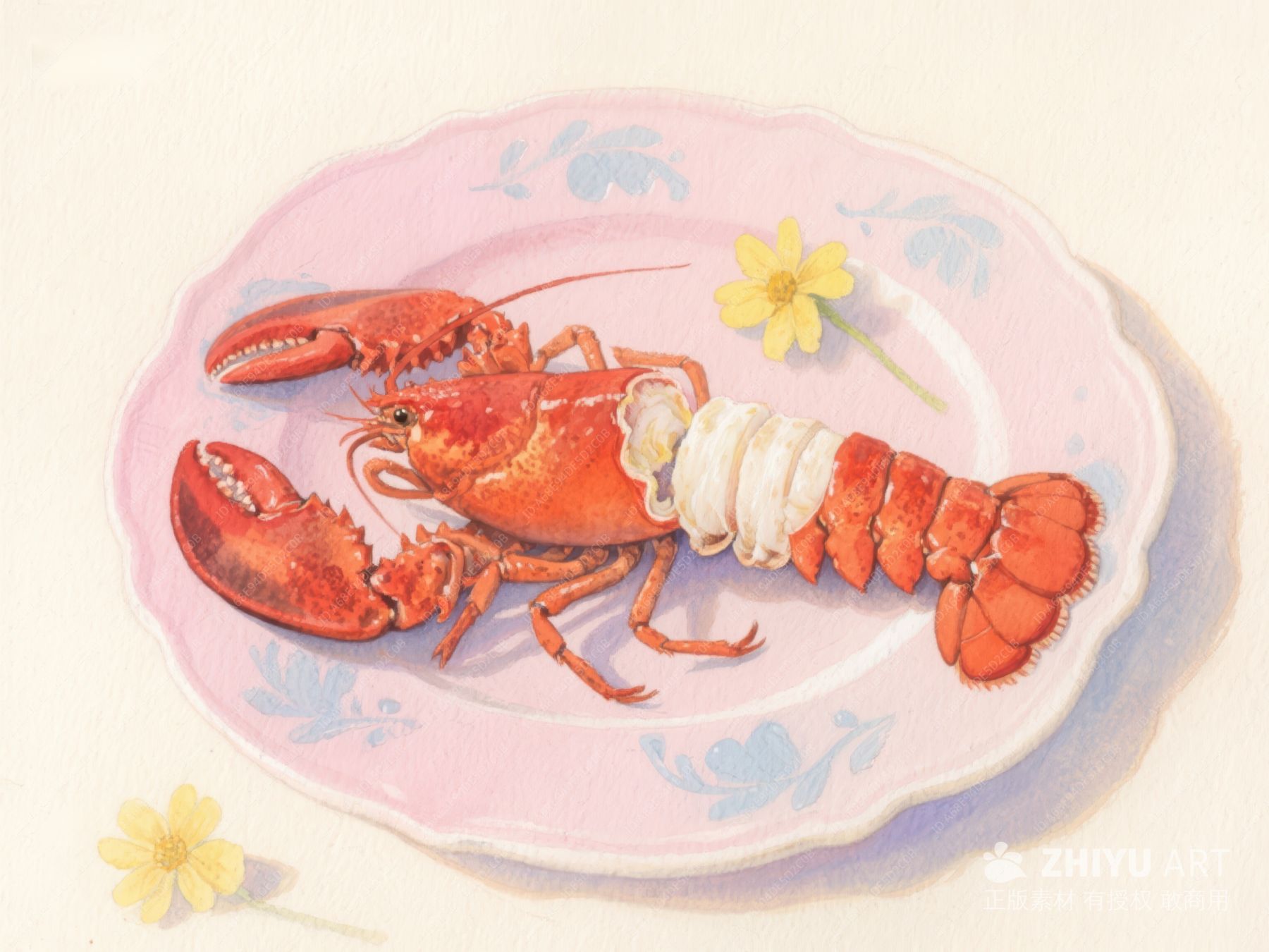 盘中的煮熟龙虾配黄花