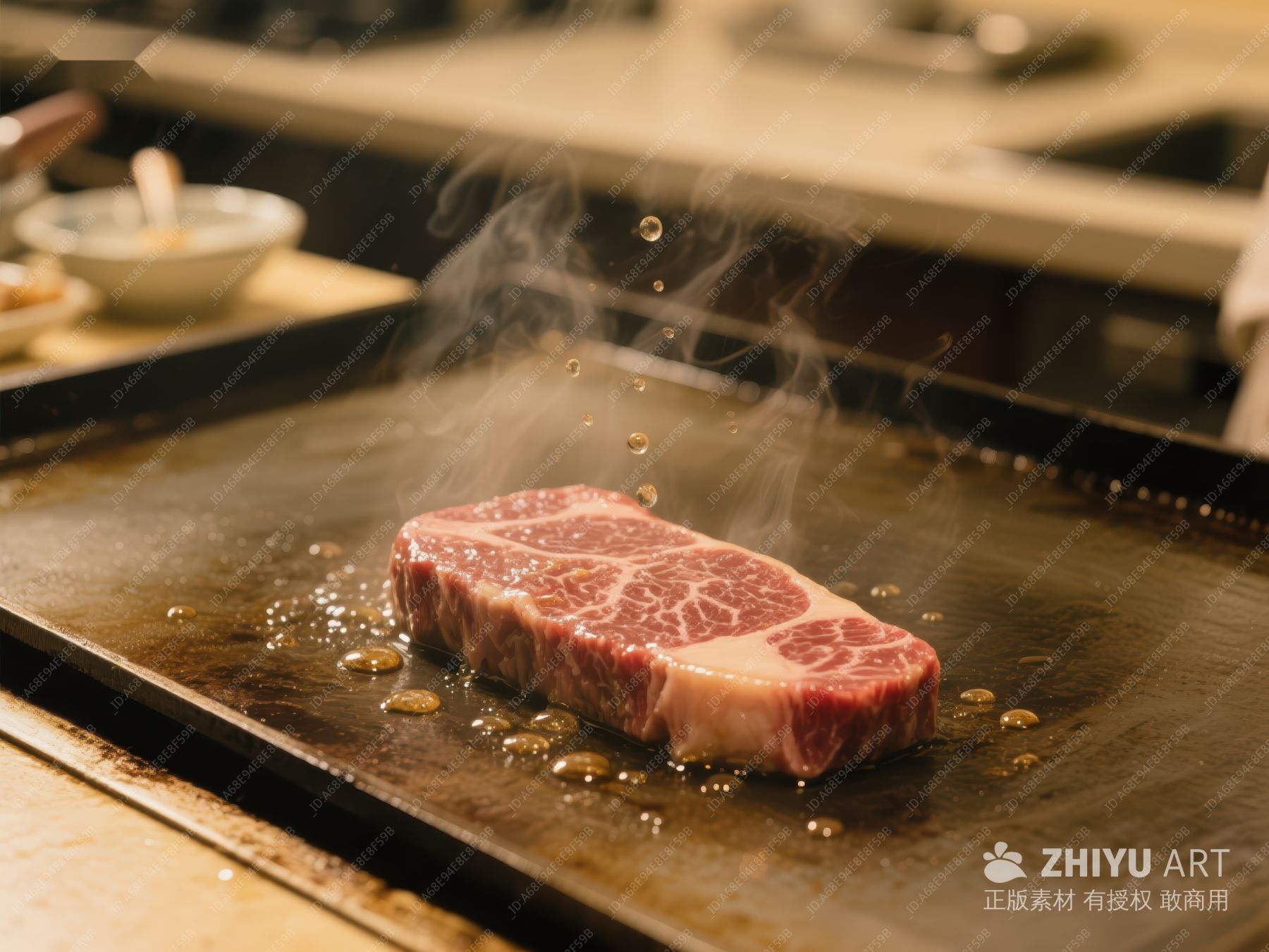 铁板上烤制的牛排冒着热气