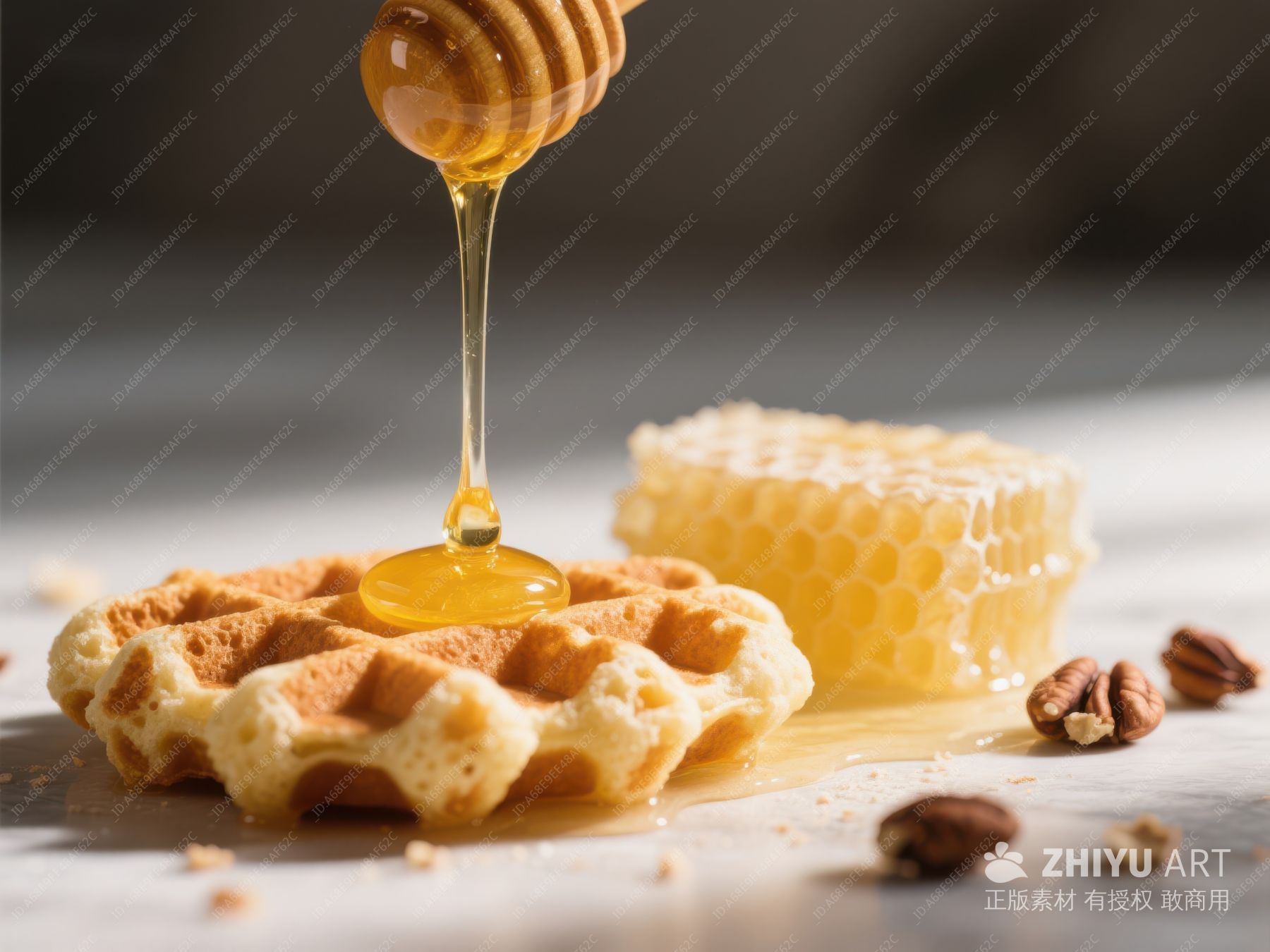 蜂蜜滴落华夫饼,甜蜜瞬间