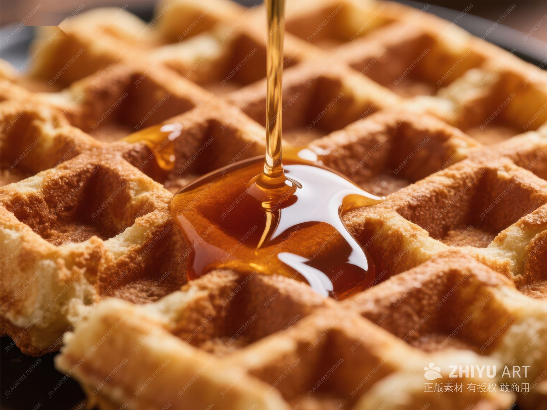 蜂蜜缓缓浇在金黄松软的华夫饼上