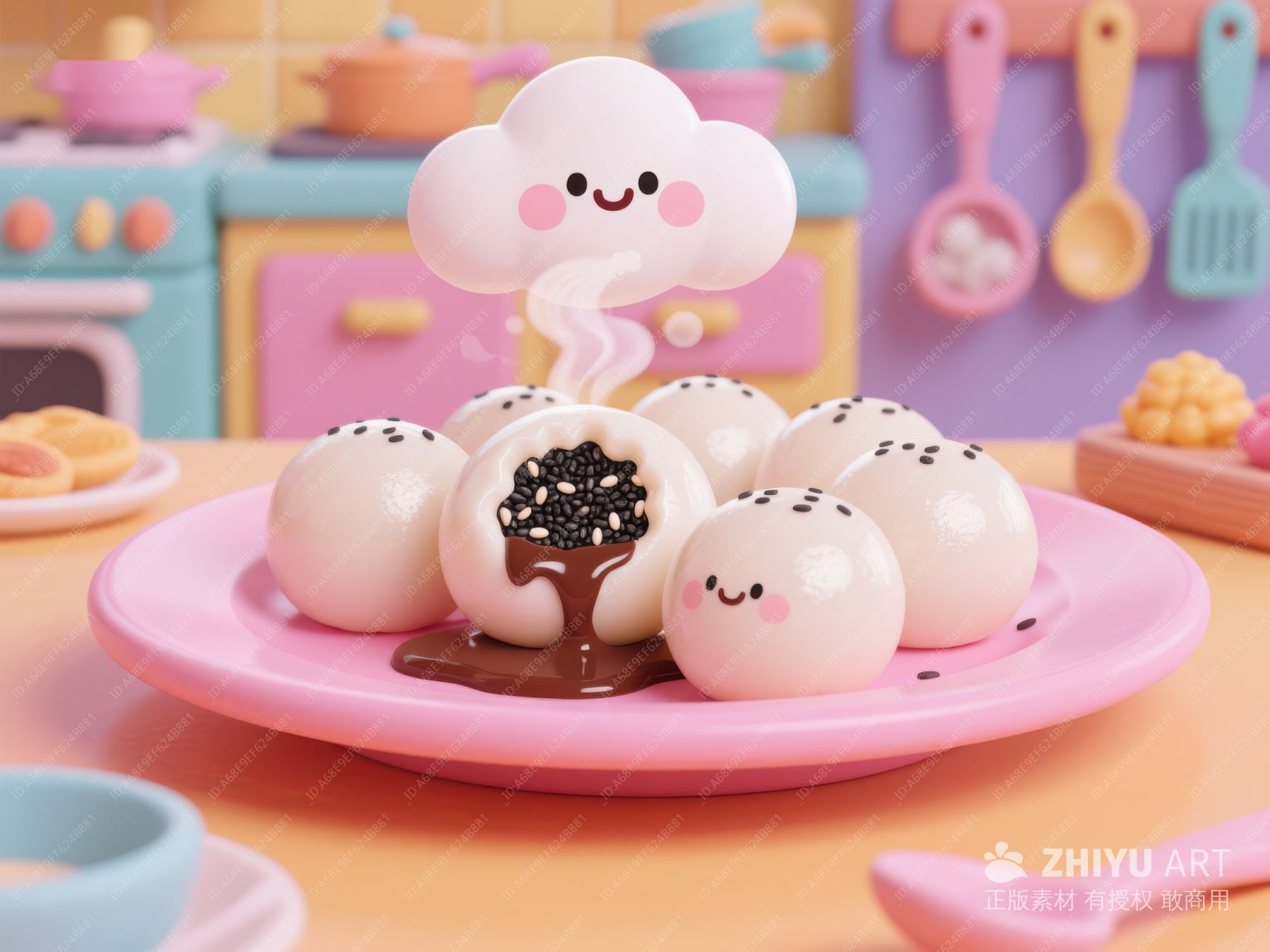 可爱汤圆与蒸汽云朵的温馨厨房场景