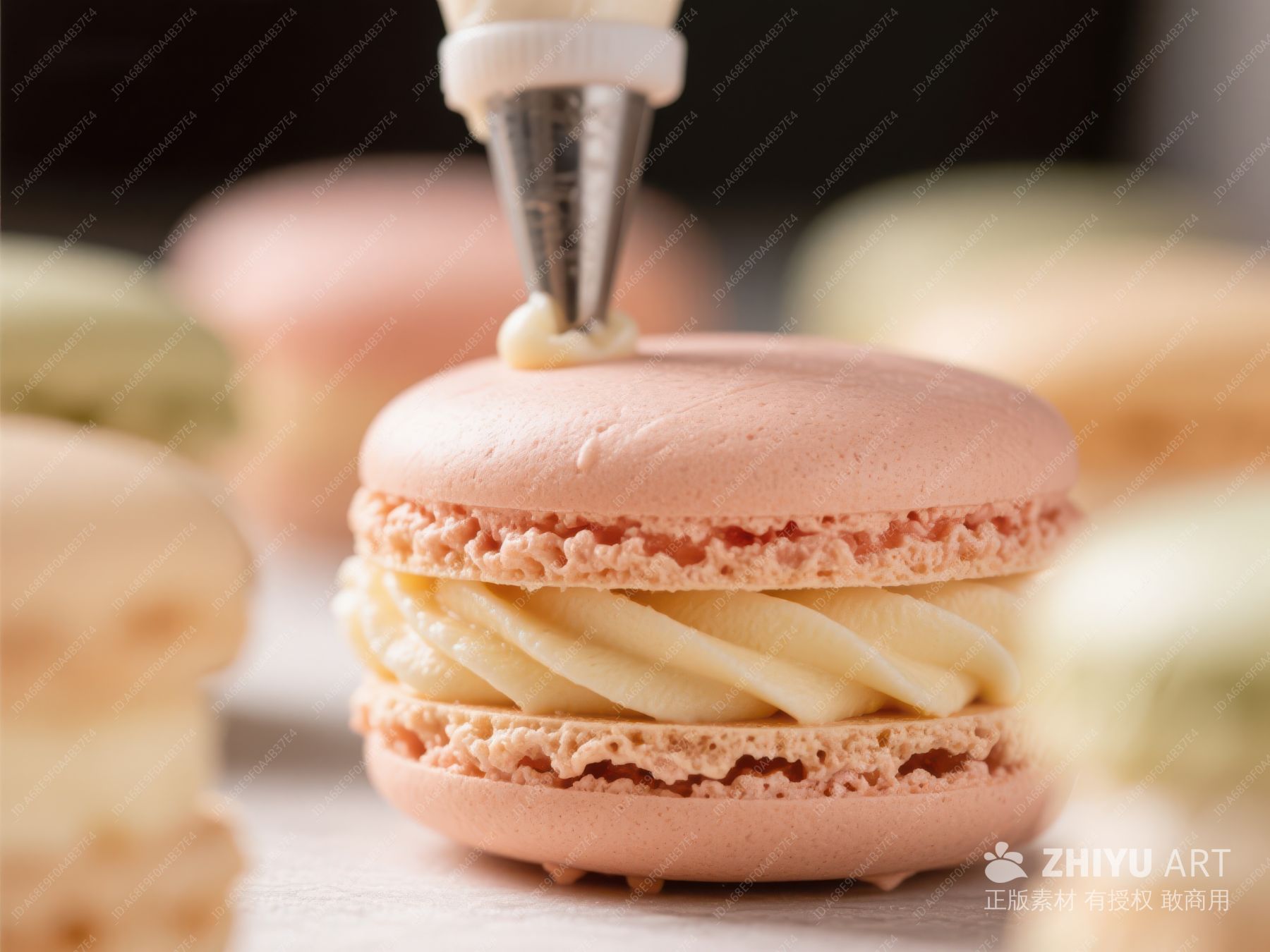 粉色马卡龙挤奶油特写