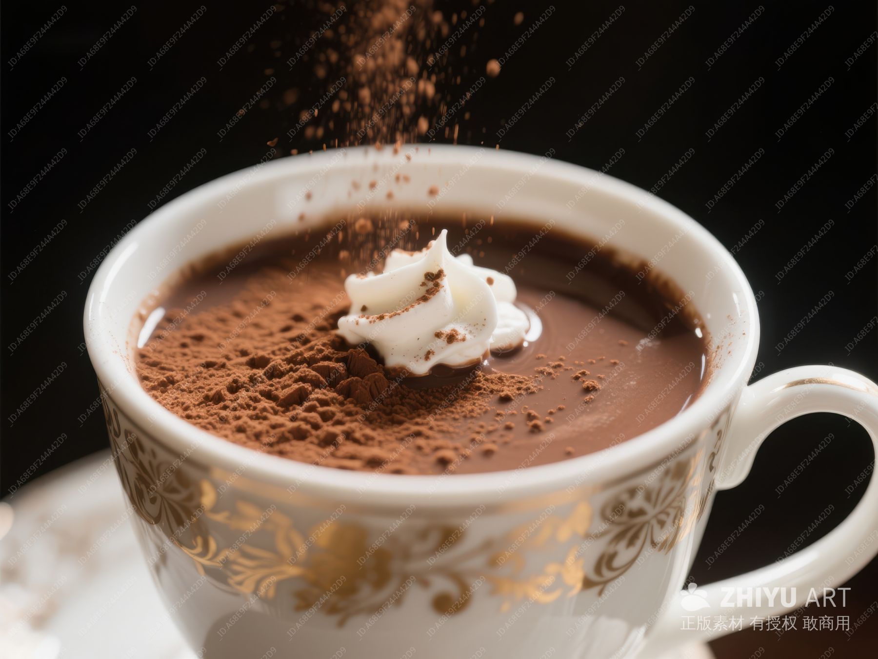 热巧克力配奶油与可可粉撒落