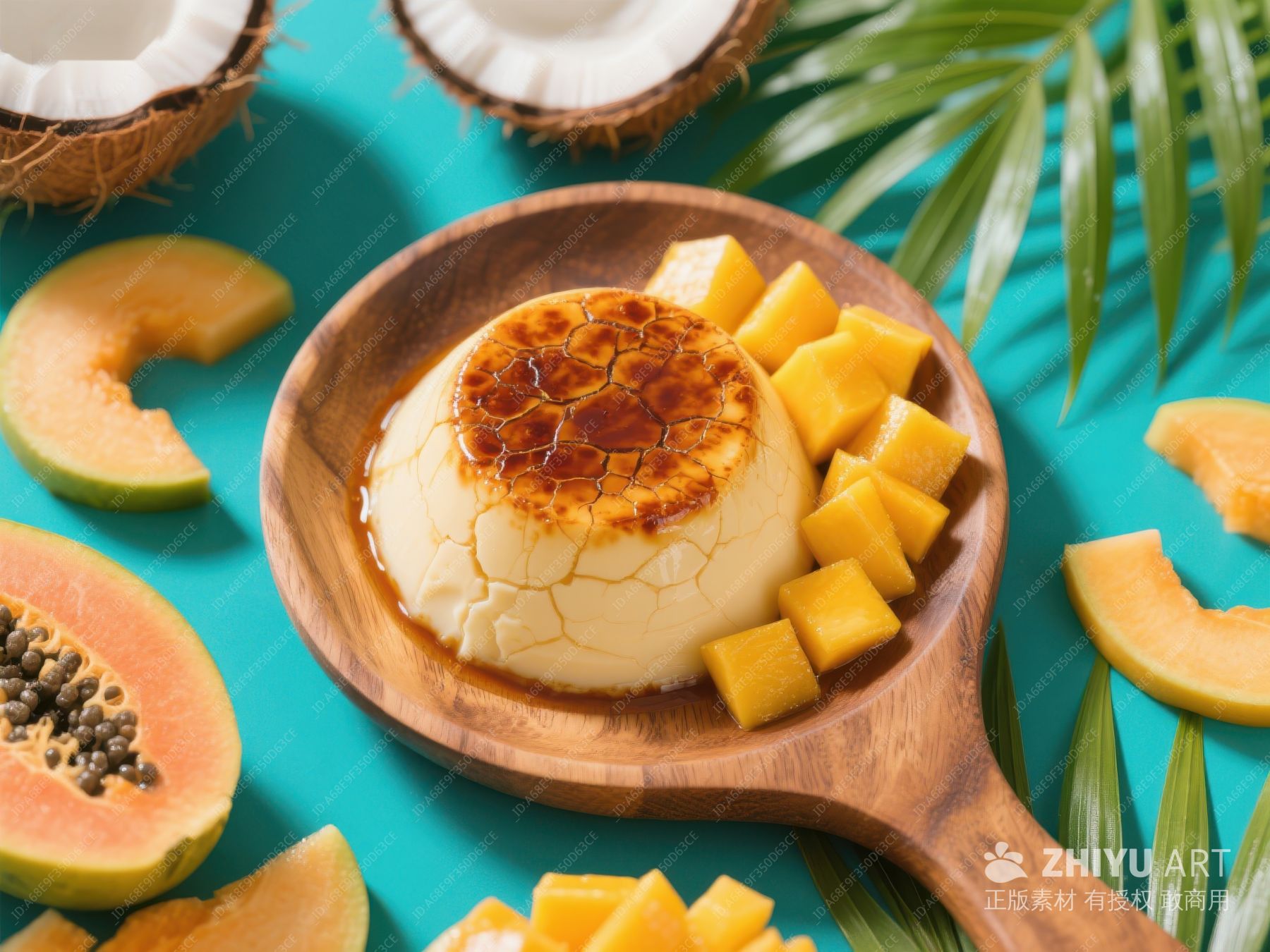 椰壳焦糖布丁配芒果块