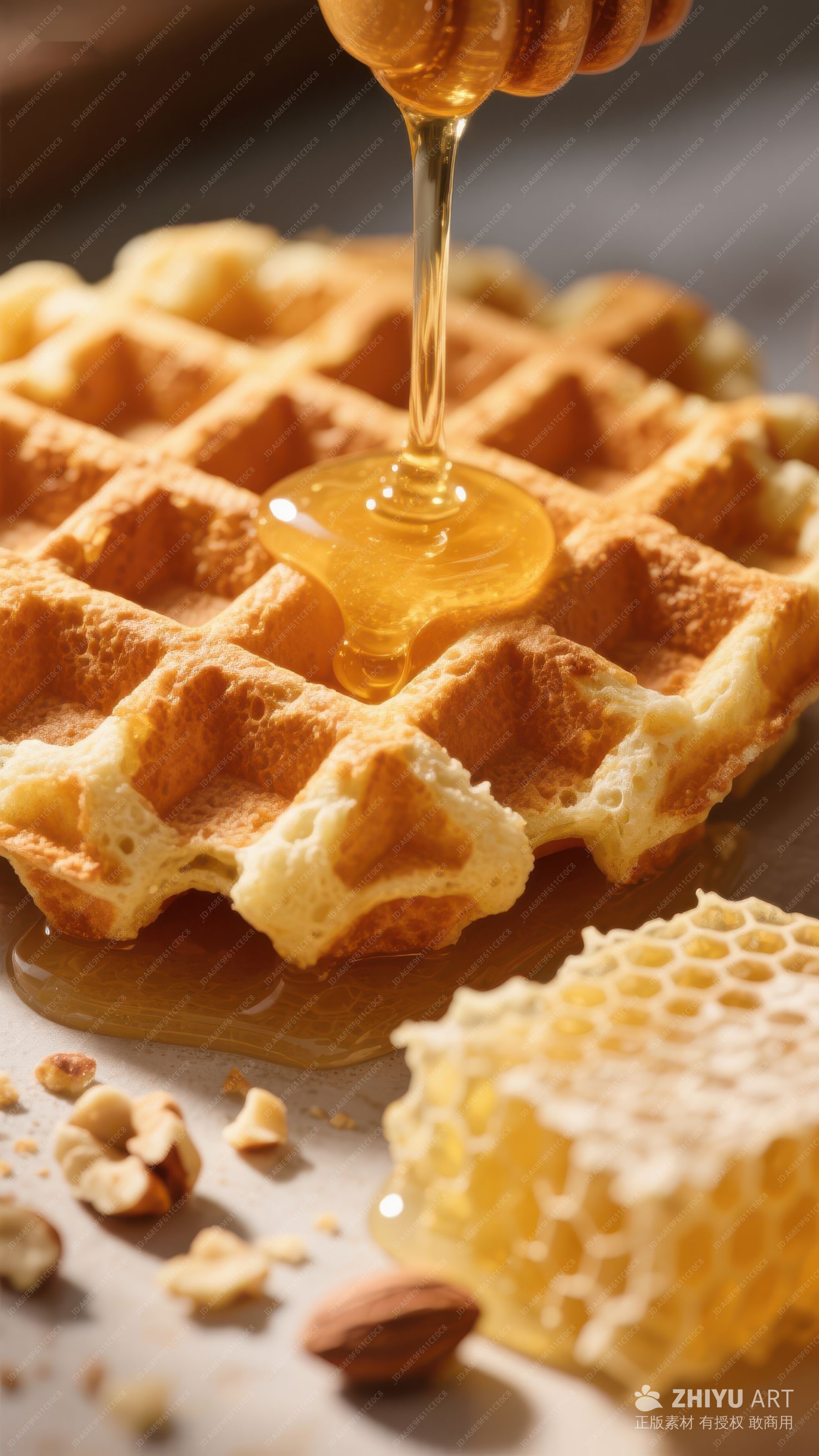 蜂蜜滴落华夫饼,美味早餐瞬间