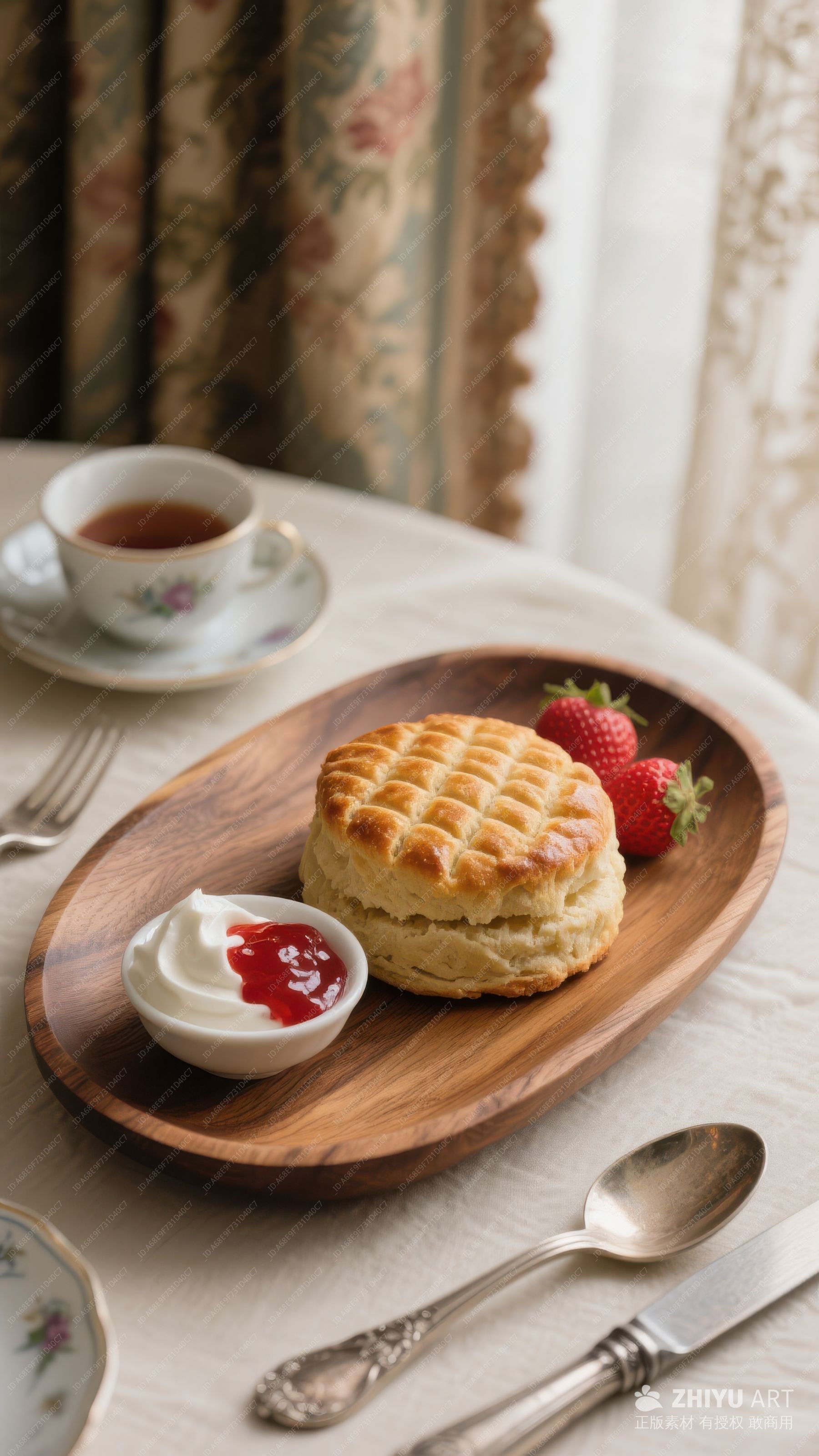 木盘上的松饼配奶油和草莓