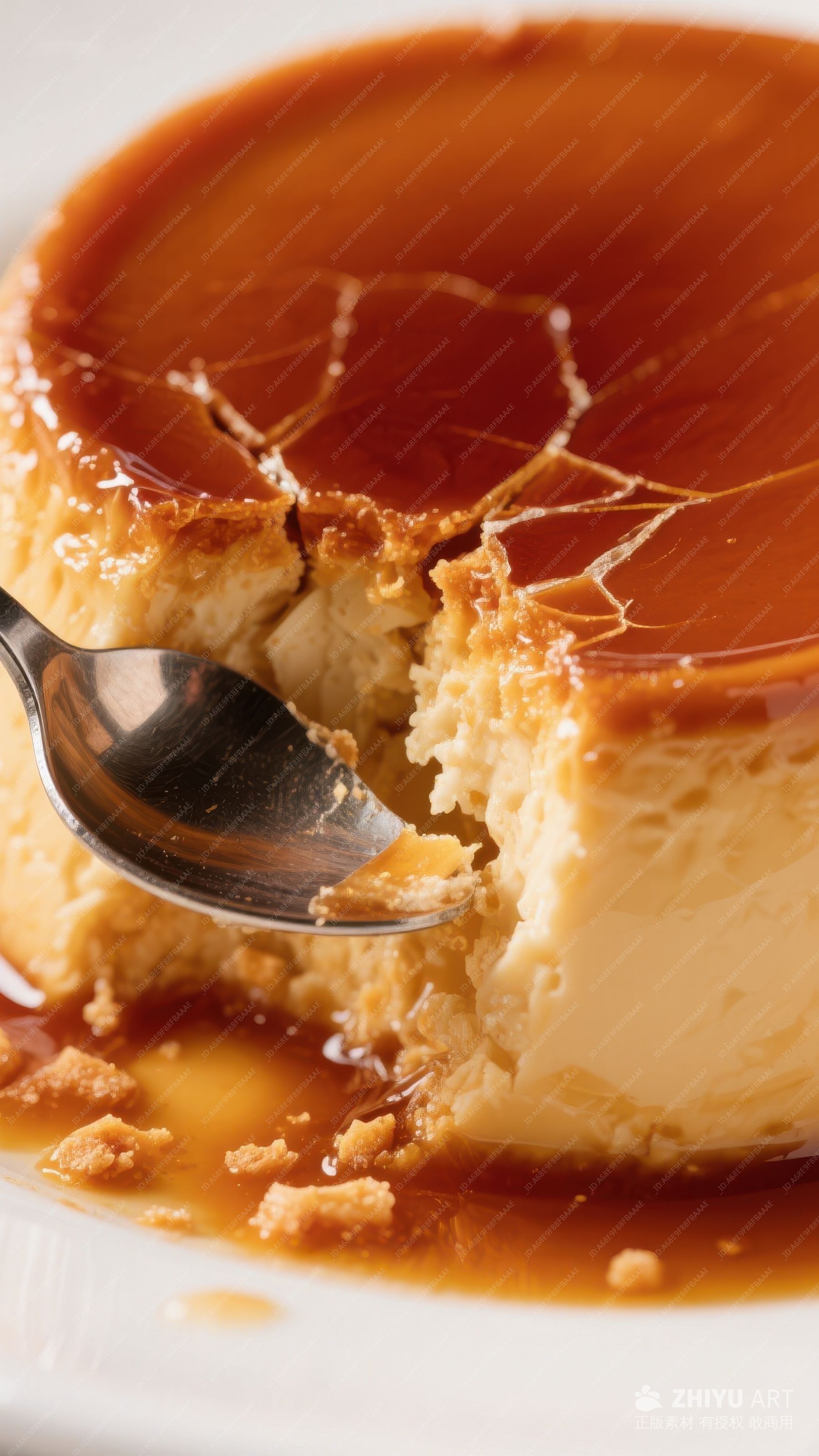 焦糖布丁特写,勺子舀起瞬间