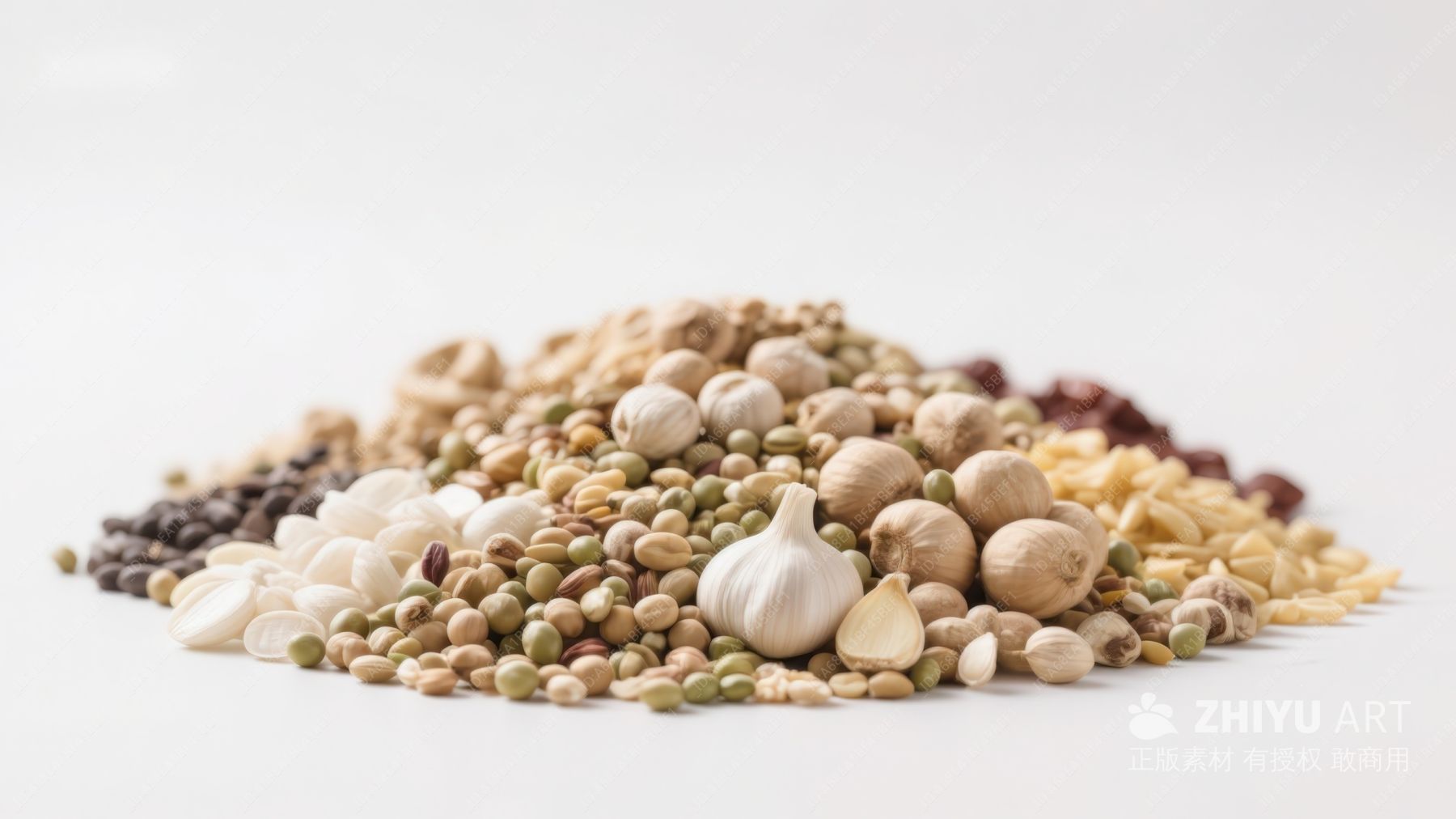 多种豆类与蒜瓣的混合堆