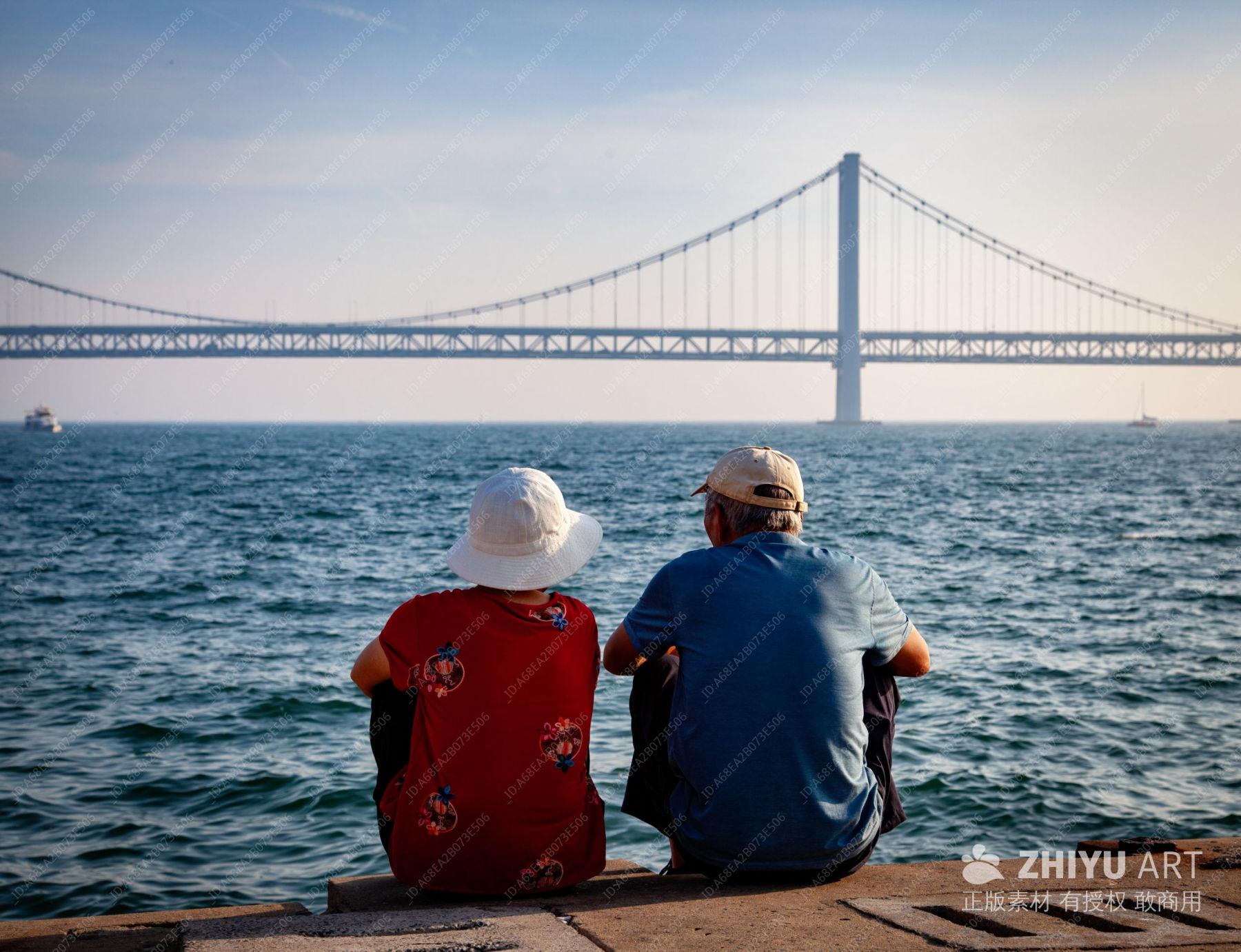 情侣 海边 大桥 休闲 浪漫 夕阳 旅行 自媒体 风景 放松 地平线 服装 建筑 水域 海 蓝色 海洋 外套 白色 湖泊 吊桥 人 斜拉桥 地标建筑 自然景观 颜色