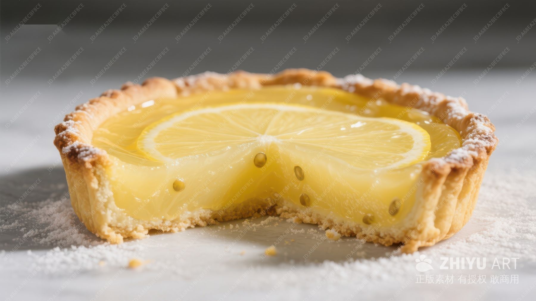 柠檬挞特写,切开一角展示果冻状馅料