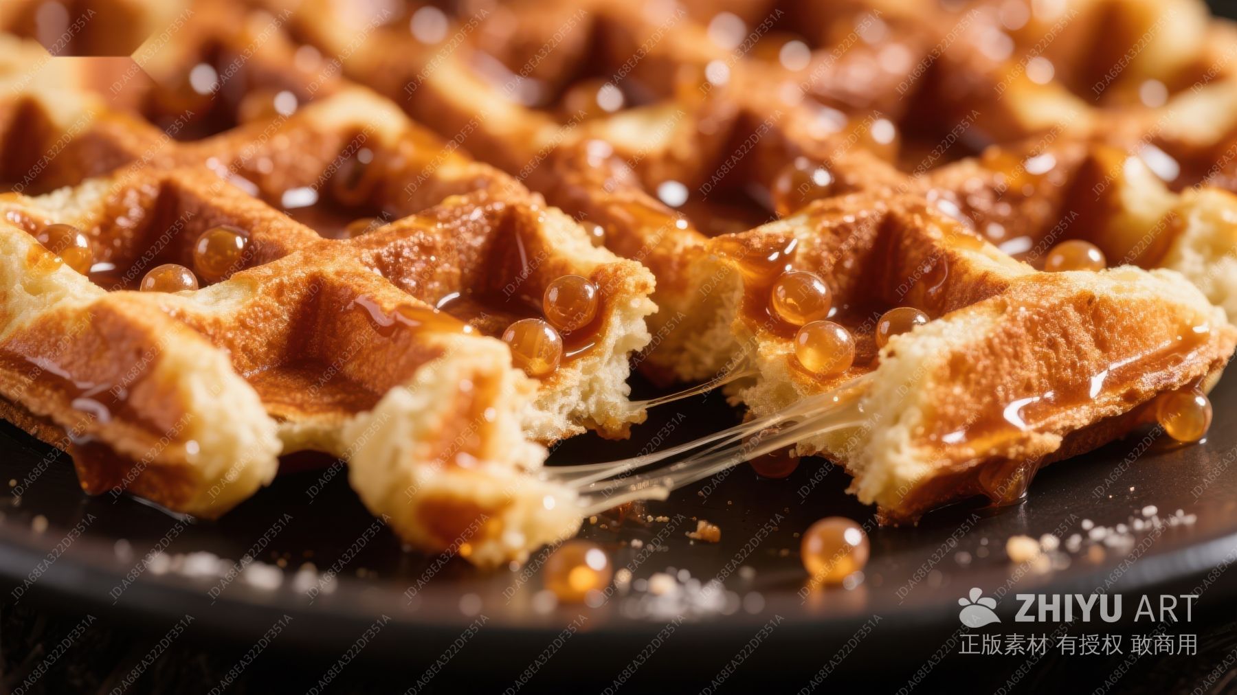 蜂蜜缓缓浇在金黄松软的华夫饼上