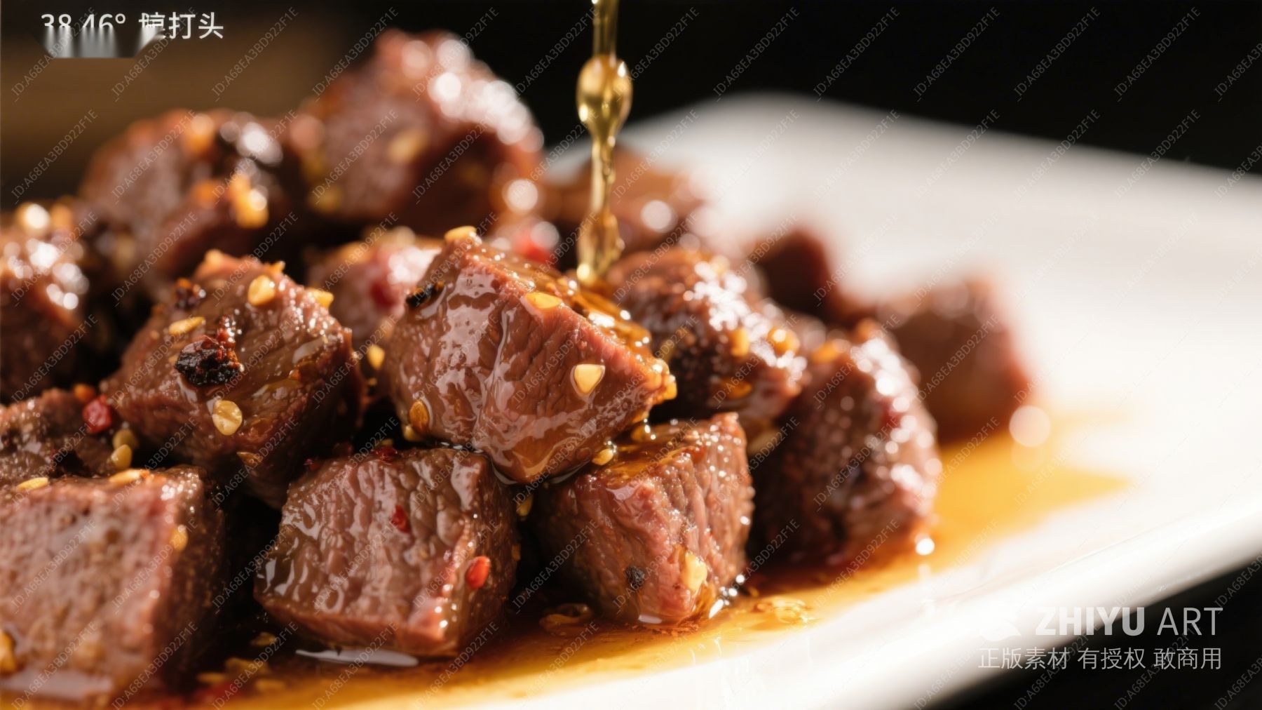 酱汁淋洒牛肉粒,诱人美食特写
