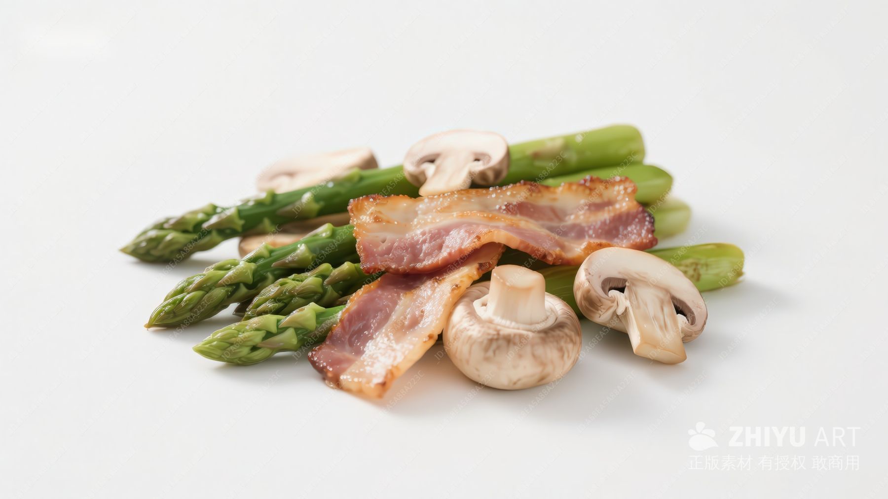 新鲜食材摆盘:芦笋、蘑菇与培根