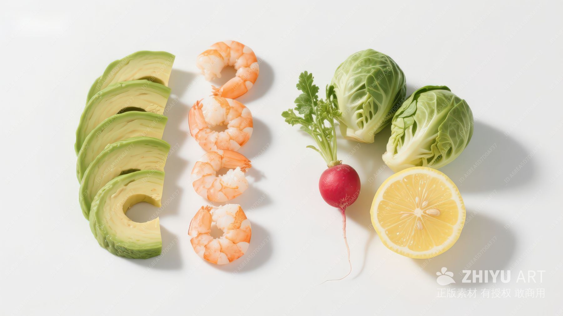 新鲜食材组合:虾仁、牛油果与生菜