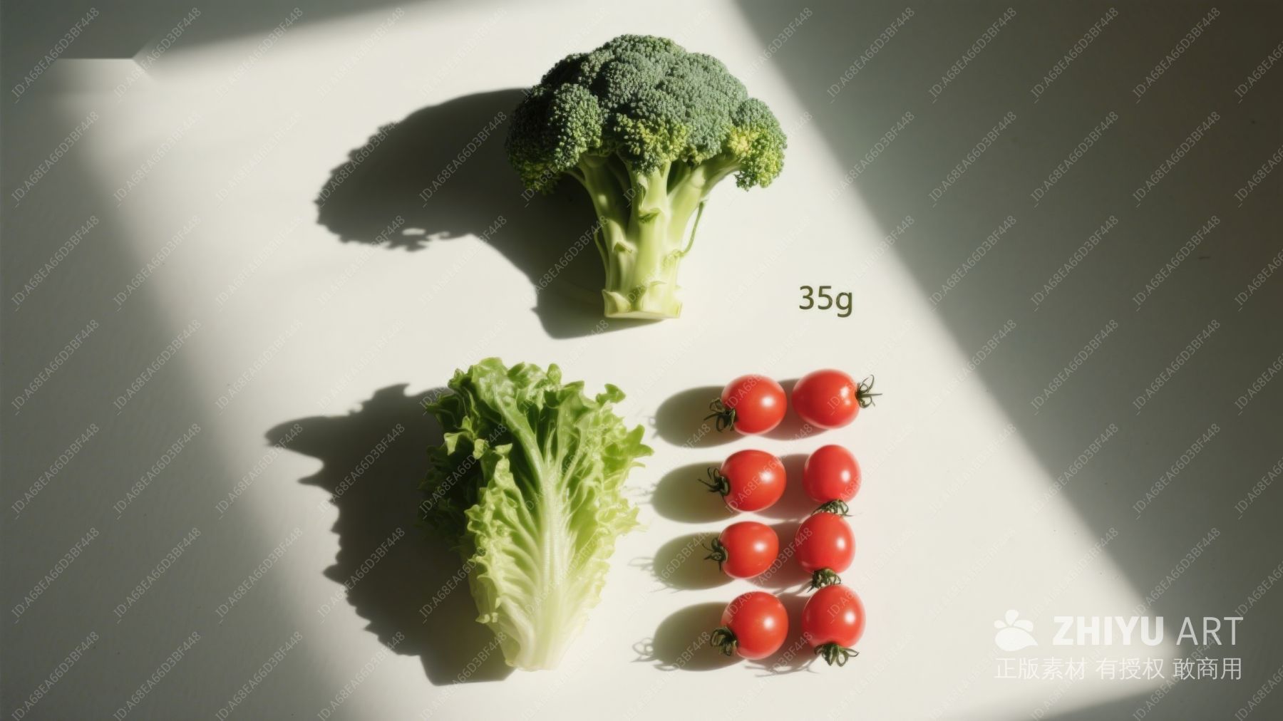 蔬菜静物:西兰花、生菜与小番茄