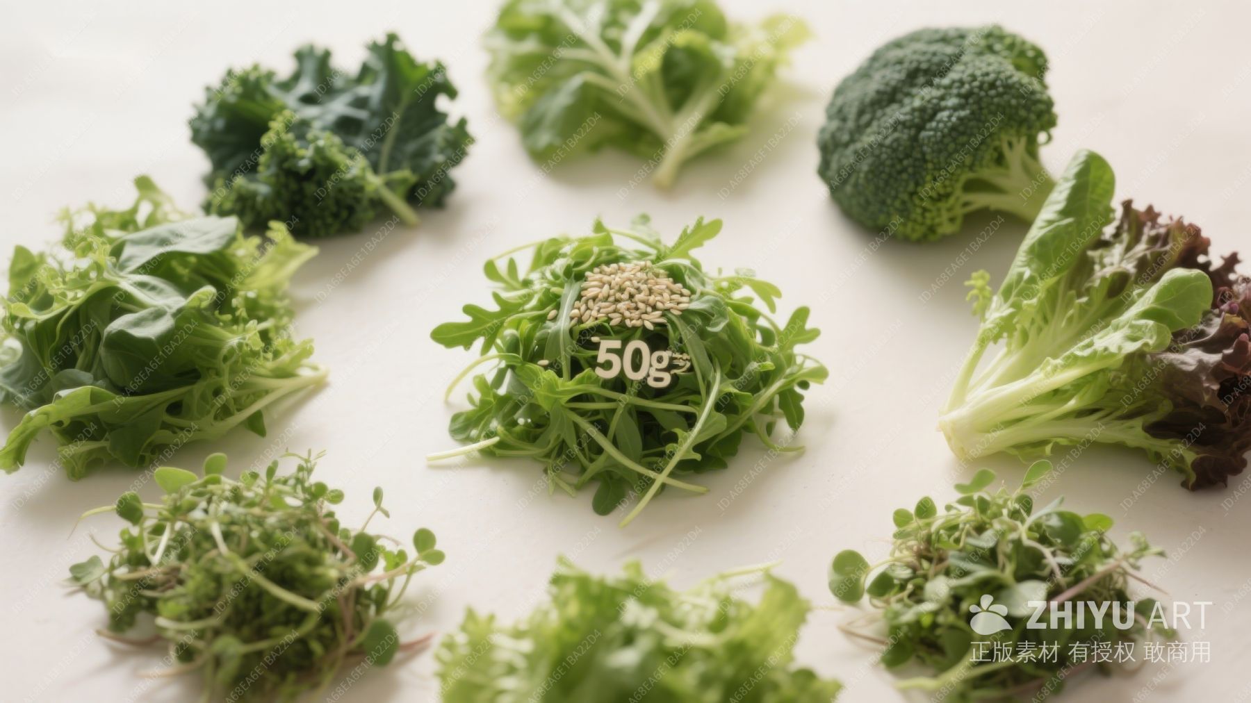 多样绿叶蔬菜与种子的组合展示