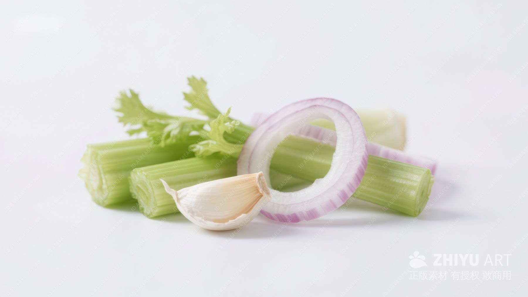 新鲜蔬菜组合:芹菜、洋葱、大蒜与香菜