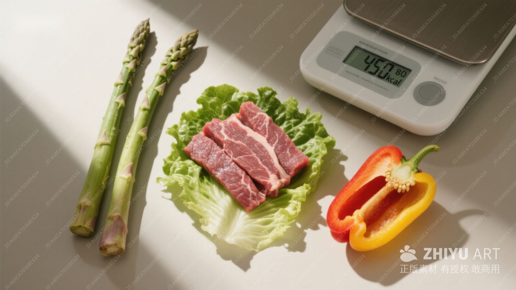 厨房秤旁的芦笋、樱桃番茄与橄榄油
