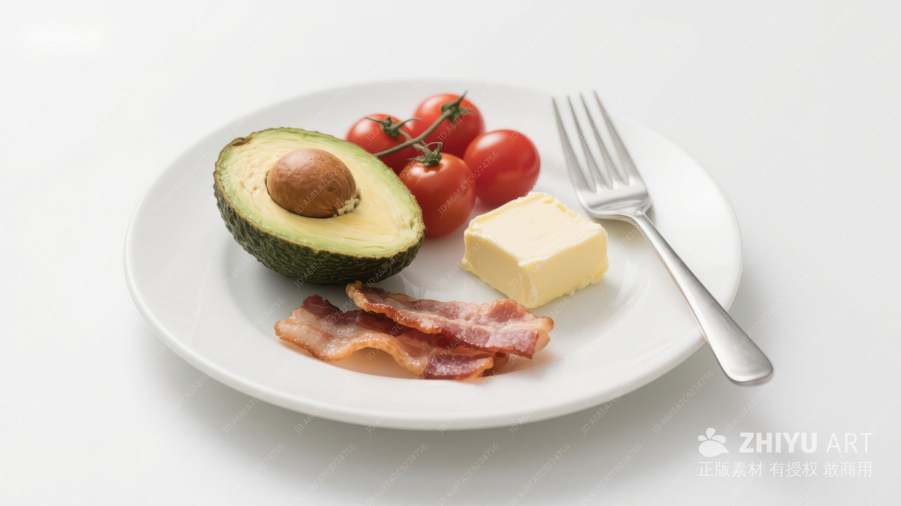 简约早餐盘:牛油果、培根、黄油与樱桃番茄