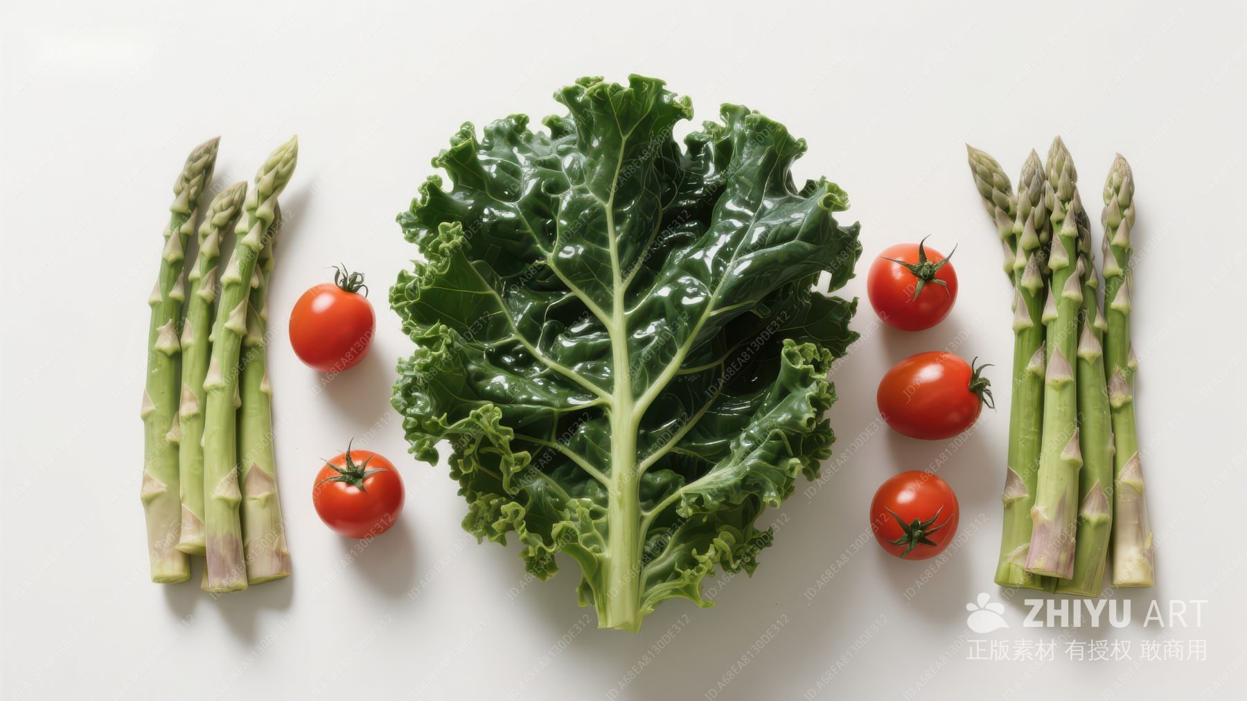 新鲜蔬菜排列:羽衣甘蓝、番茄与芦笋