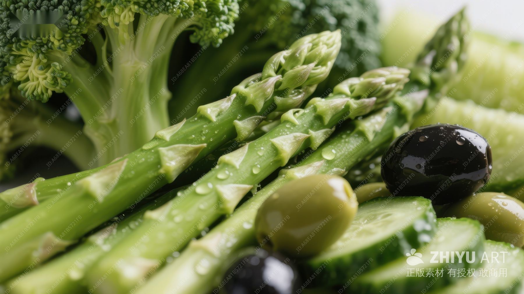 新鲜蔬菜特写:芦笋、西兰花与橄榄