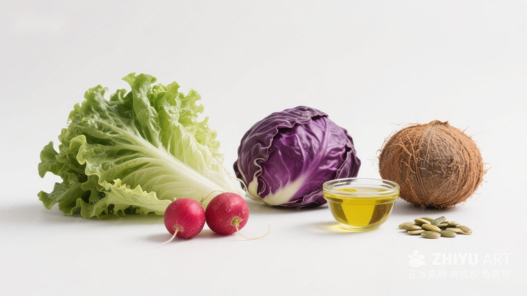 新鲜食材组合:生菜、椰子、橄榄油与樱桃番茄