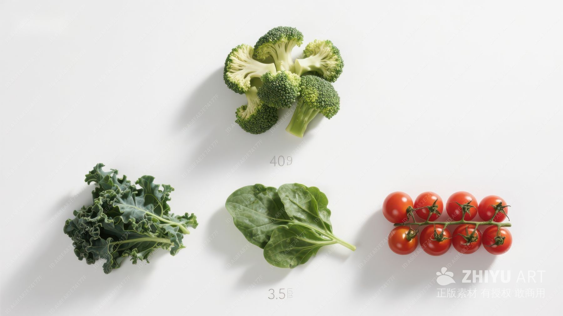 新鲜蔬菜展示:西兰花、羽衣甘蓝、菠菜和樱桃番茄